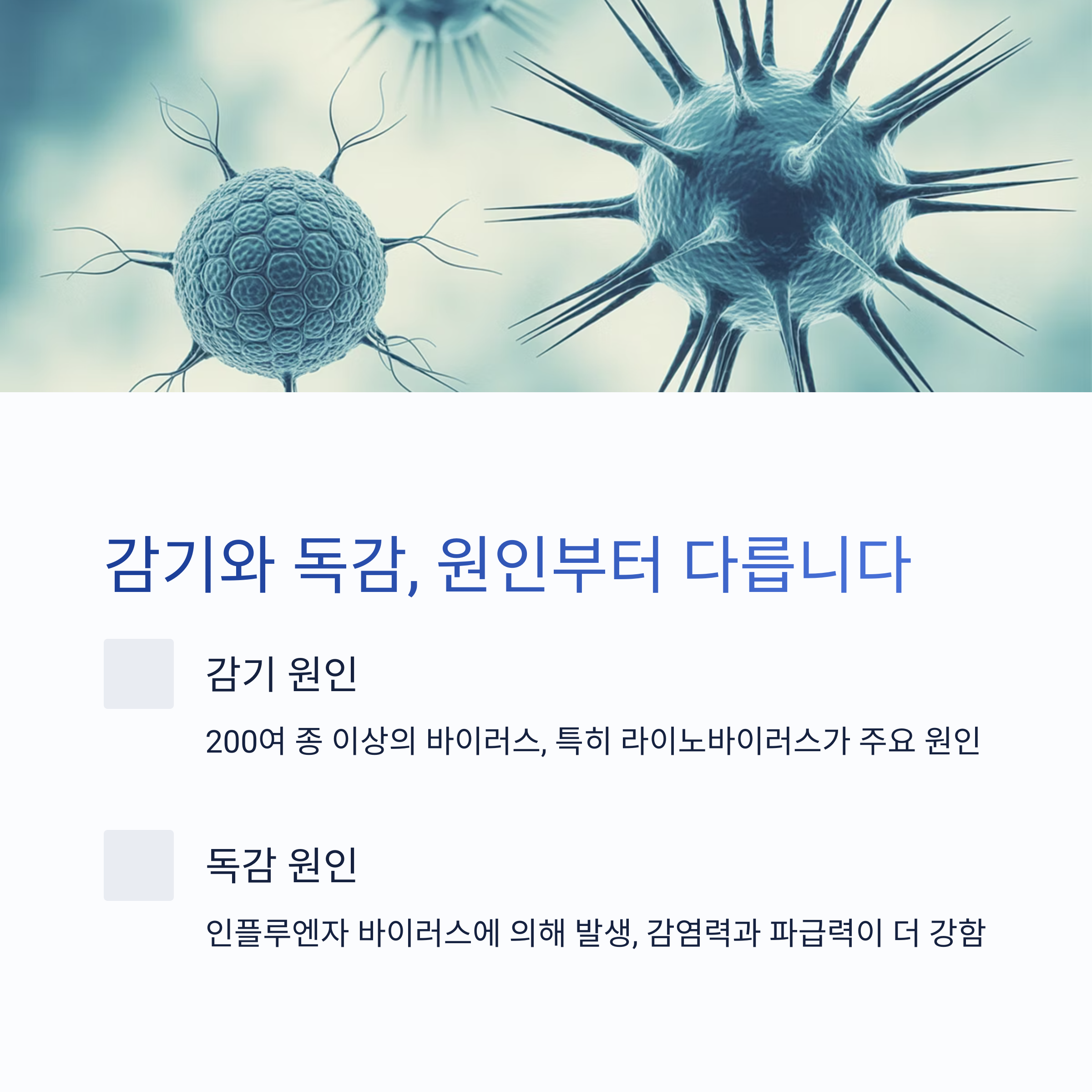 감기와 독감은 모두 흔한 호흡기 질환이지만, 그 원인과 증상, 경과가 다르기 때문에 정확히 구분하는 것이 매우 중요합니다. 감기는 주로 가벼운 증상으로 자연 치유되지만, 독감은 심한 전신 증상과 합병증으로 이어질 수 있으므로 조기 대응이 필요합니다.