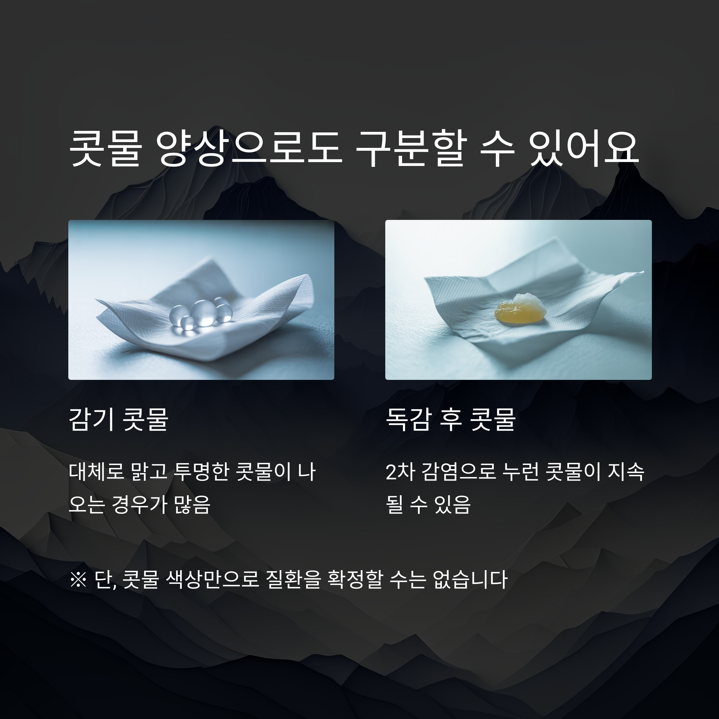 하지만 콧물의 색만으로 두 질환을 확정할 수는 없으므로 종합적인 판단이 필요합니다.
