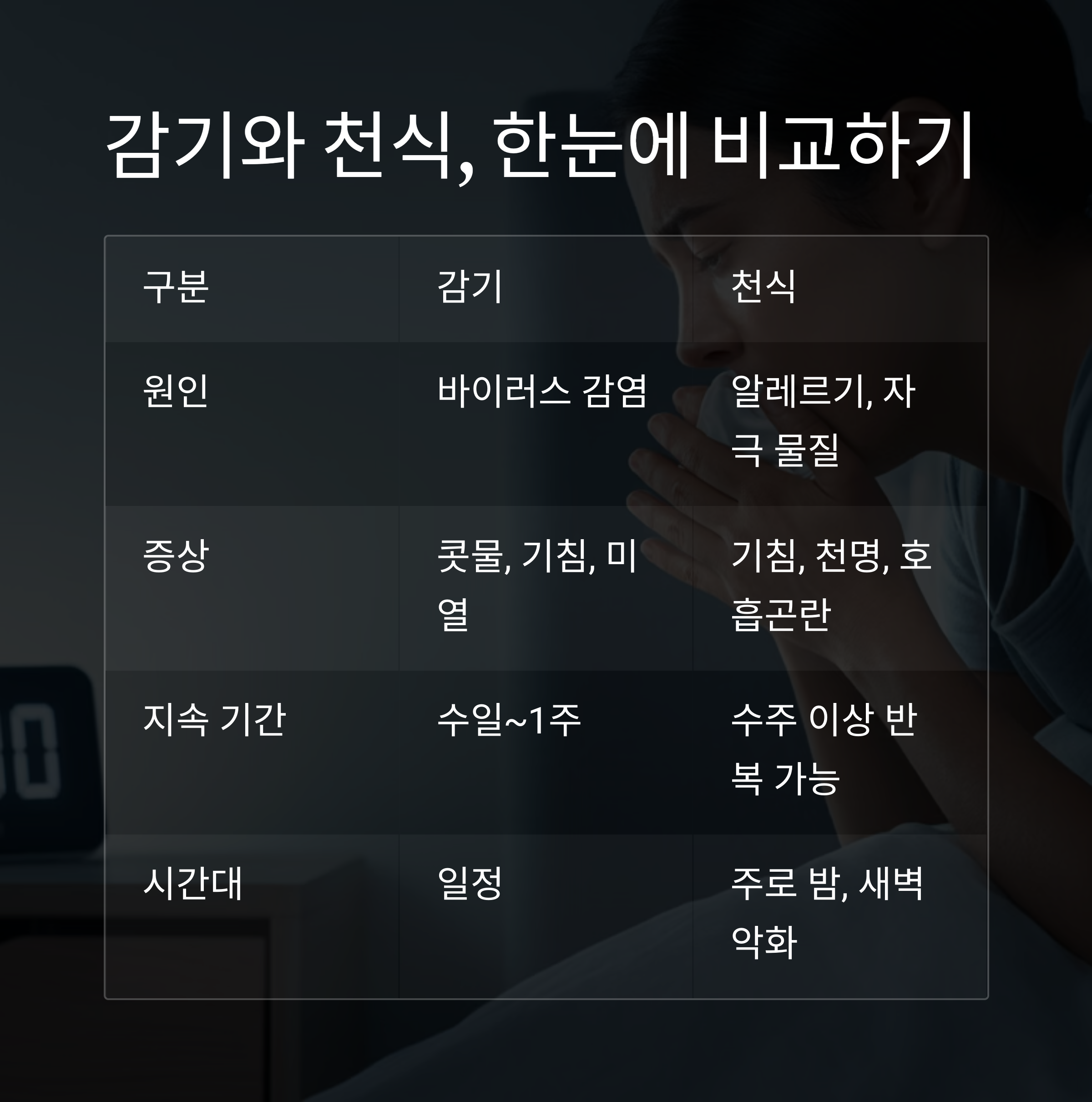 다음 표로 감기와 천식의 주요 차이를 정리해보았습니다