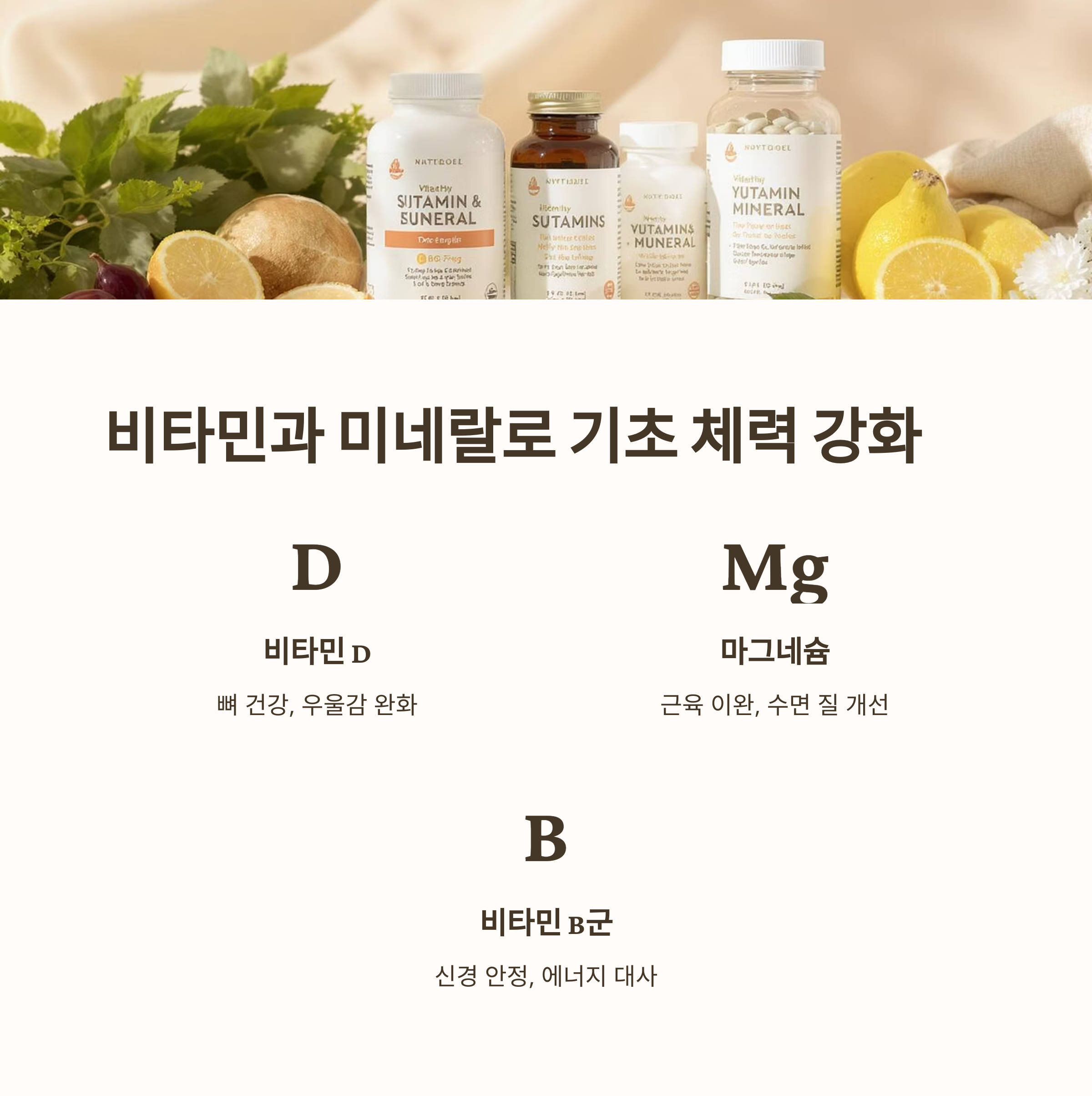 비타민 D는 골다공증 예방에, 비타민 B군은 신경 안정에 필수입니다.
