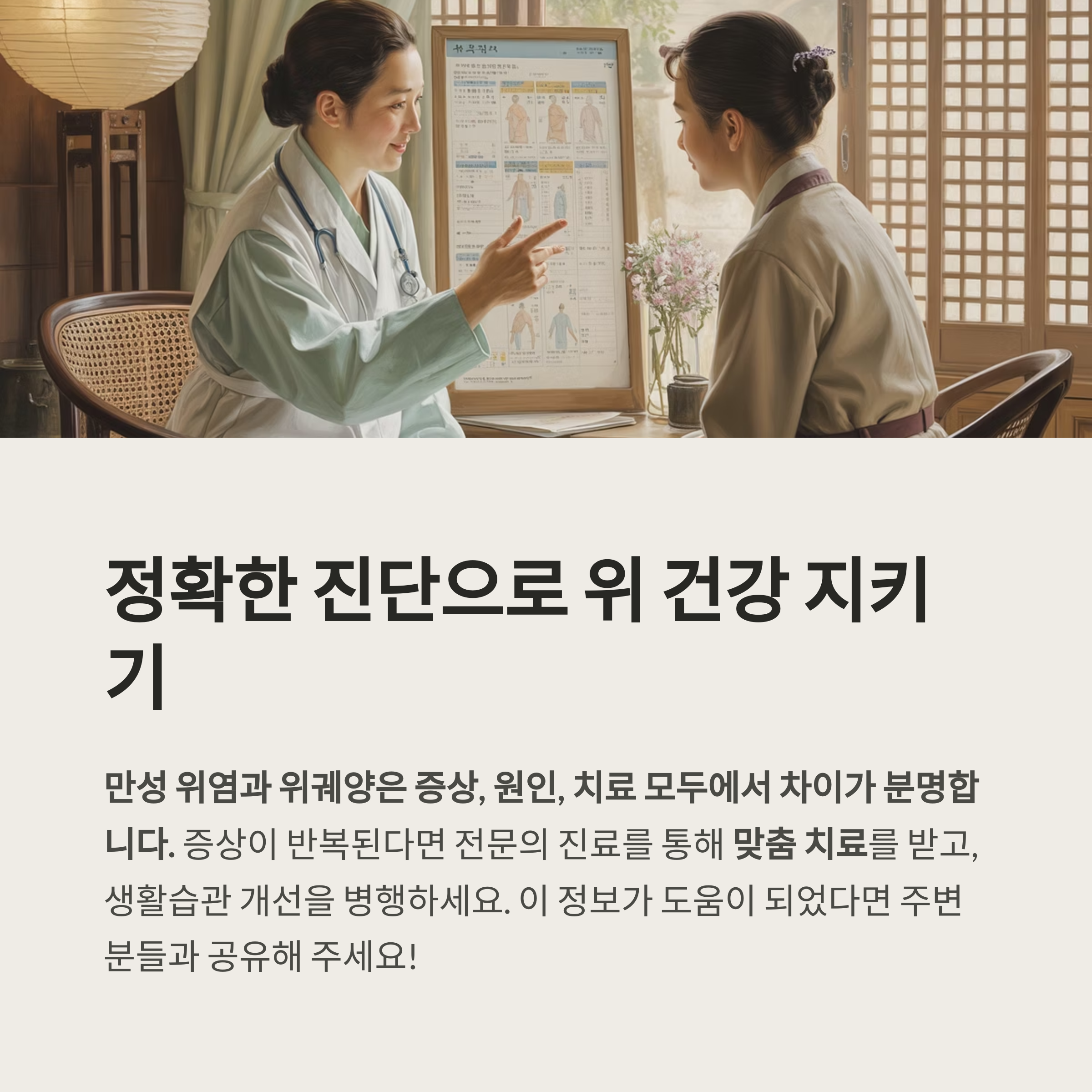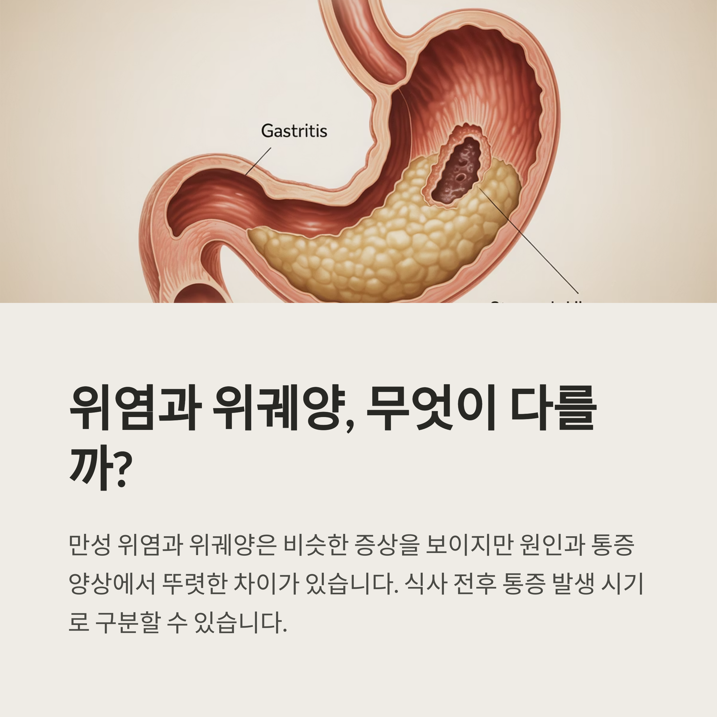 만성 위염과 위궤양은 비슷한 증상을 보이지만 원인과 통증 양상에서 뚜렷한 차이를 보입니다.