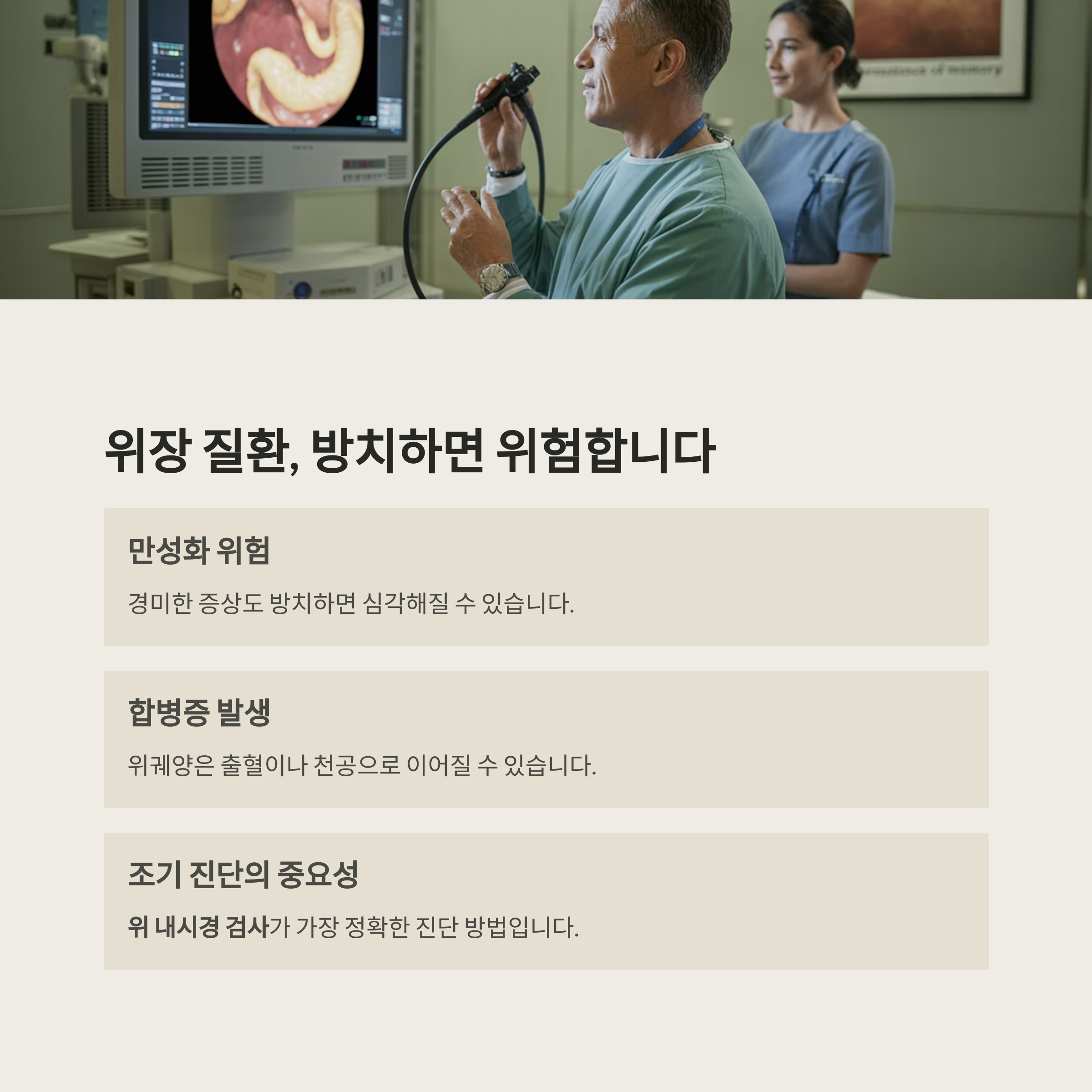 특히 위궤양은 출혈이나 천공으로 이어질 수 있어 조기 진단이 필수입니다.