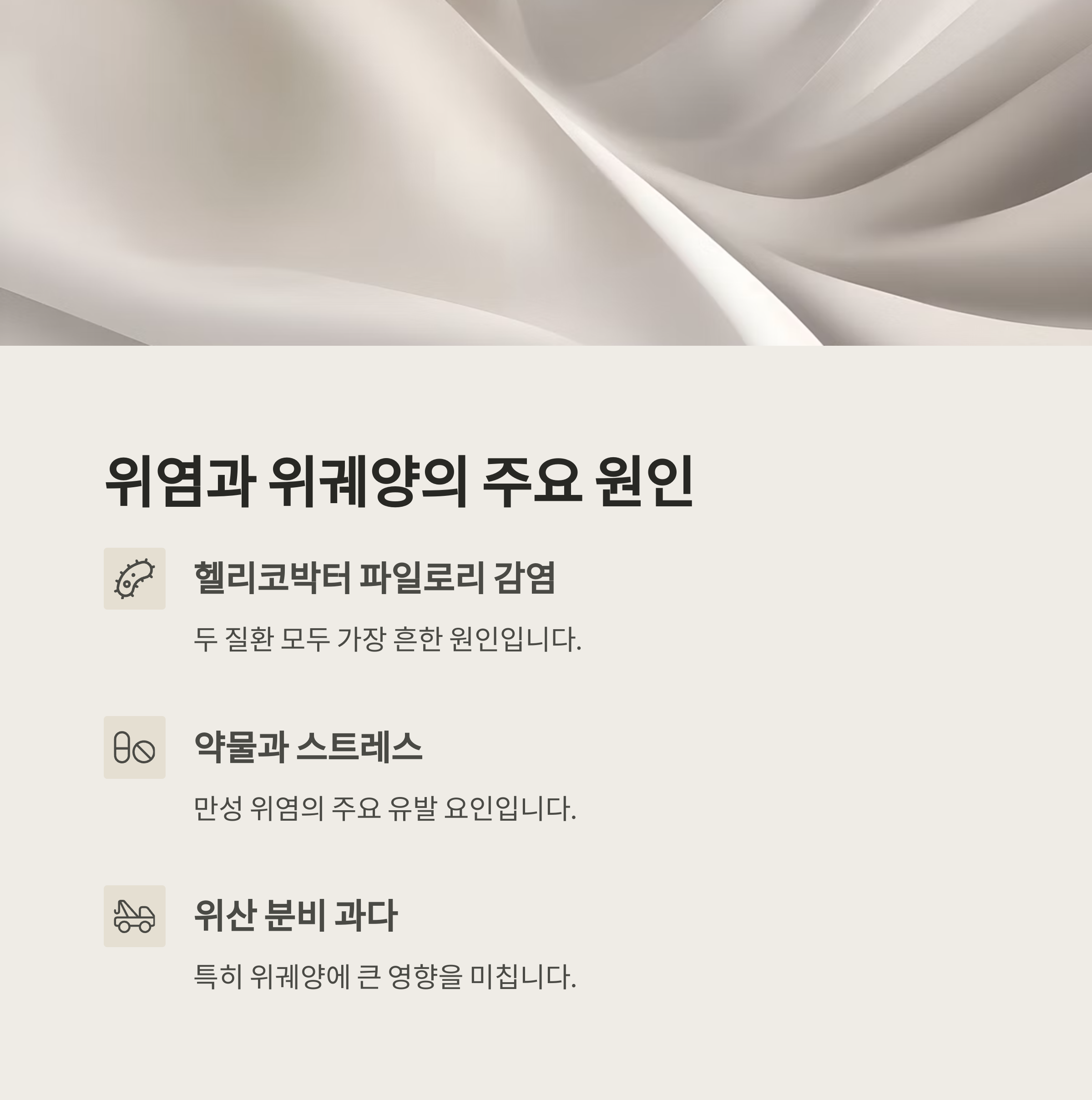 주요 원인으로 작용합니다. 위궤양 역시 헬리코박터 감염이 가장 흔한 원인이며,