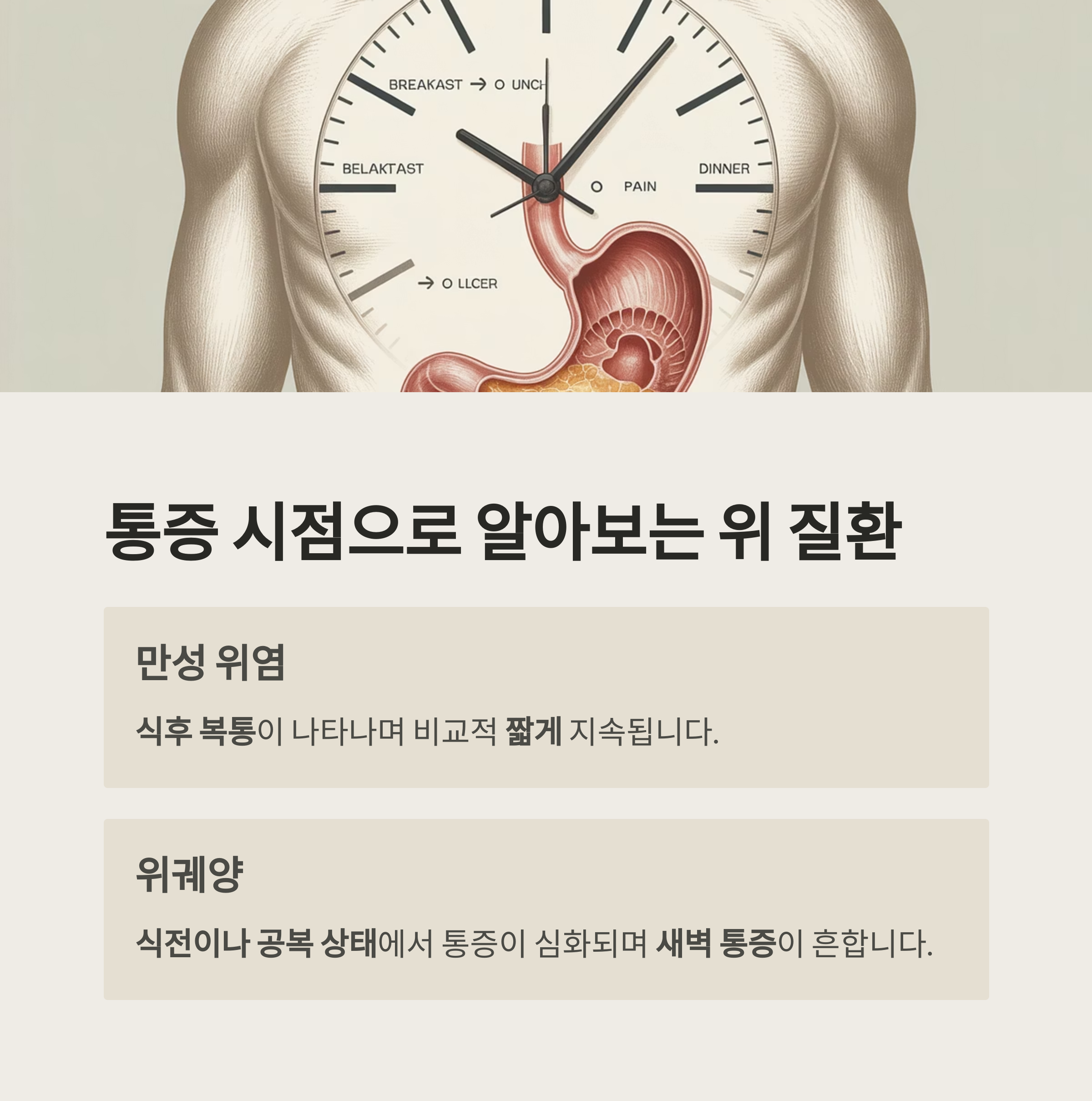 | 복통 발생 시점 | 식후 또는 비어 있을 때 악화 | 공복 상태, 새벽 통증 |