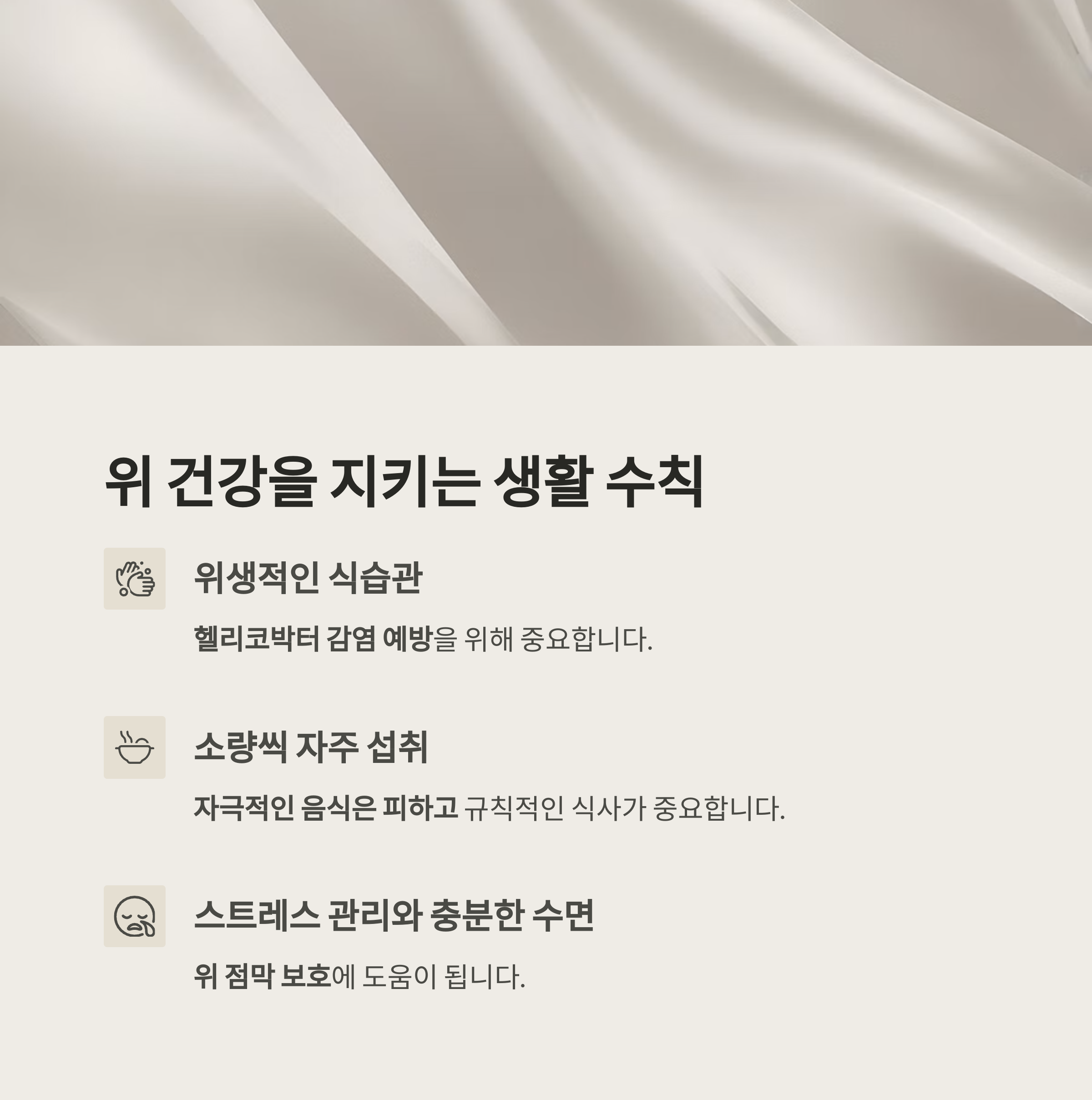 또한 스트레스 조절과 충분한 수면, 금연이 위 점막 보호에 중요한 역할을 합니다.