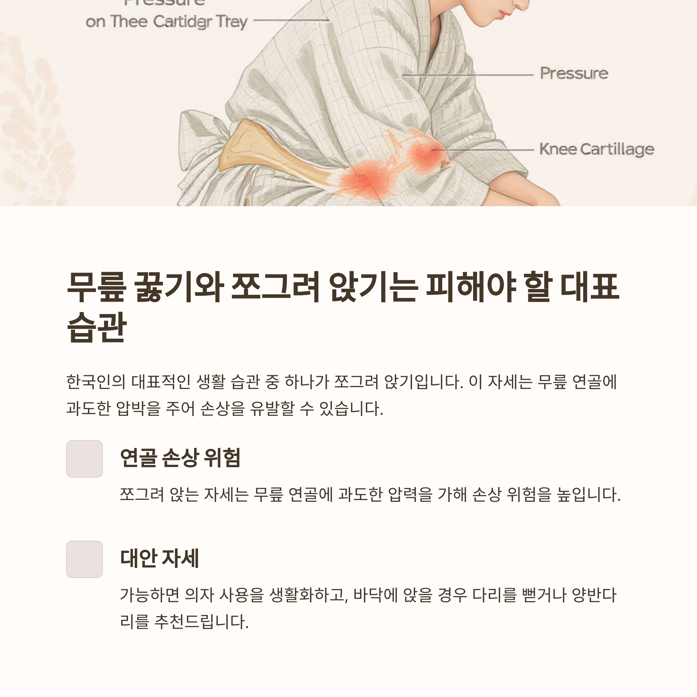 무릎 꿇기와 쪼그려 앉기는 피해야 할 대표 습관입니다