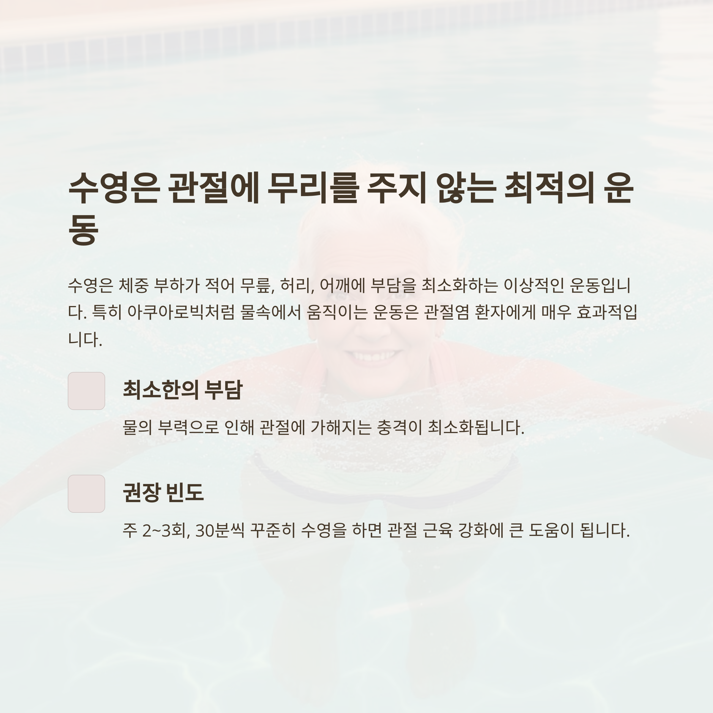 주 2~3회, 30분씩 꾸준히 수영을 하면 관절 근육 강화에 큰 도움이 됩니다.