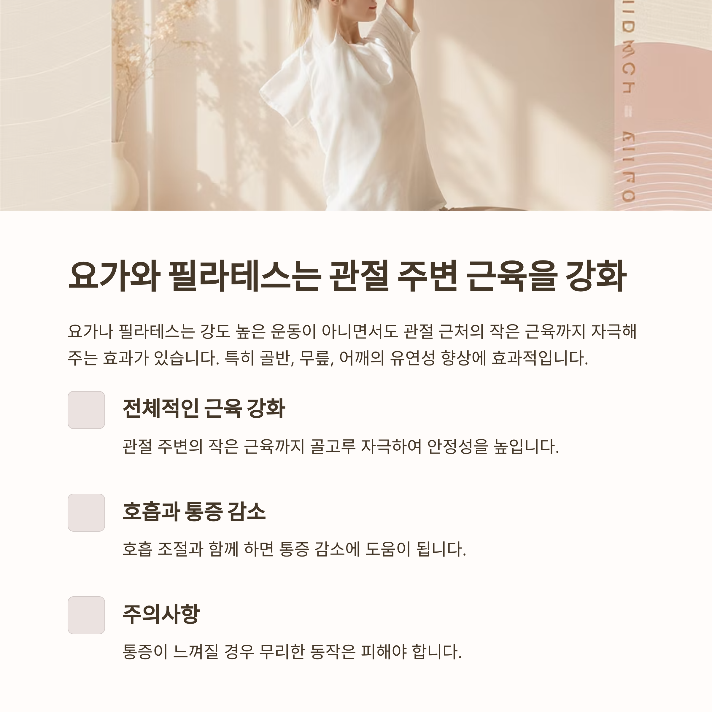 요가나 필라테스는 강도 높은 운동이 아니면서도 관절 근처의 작은