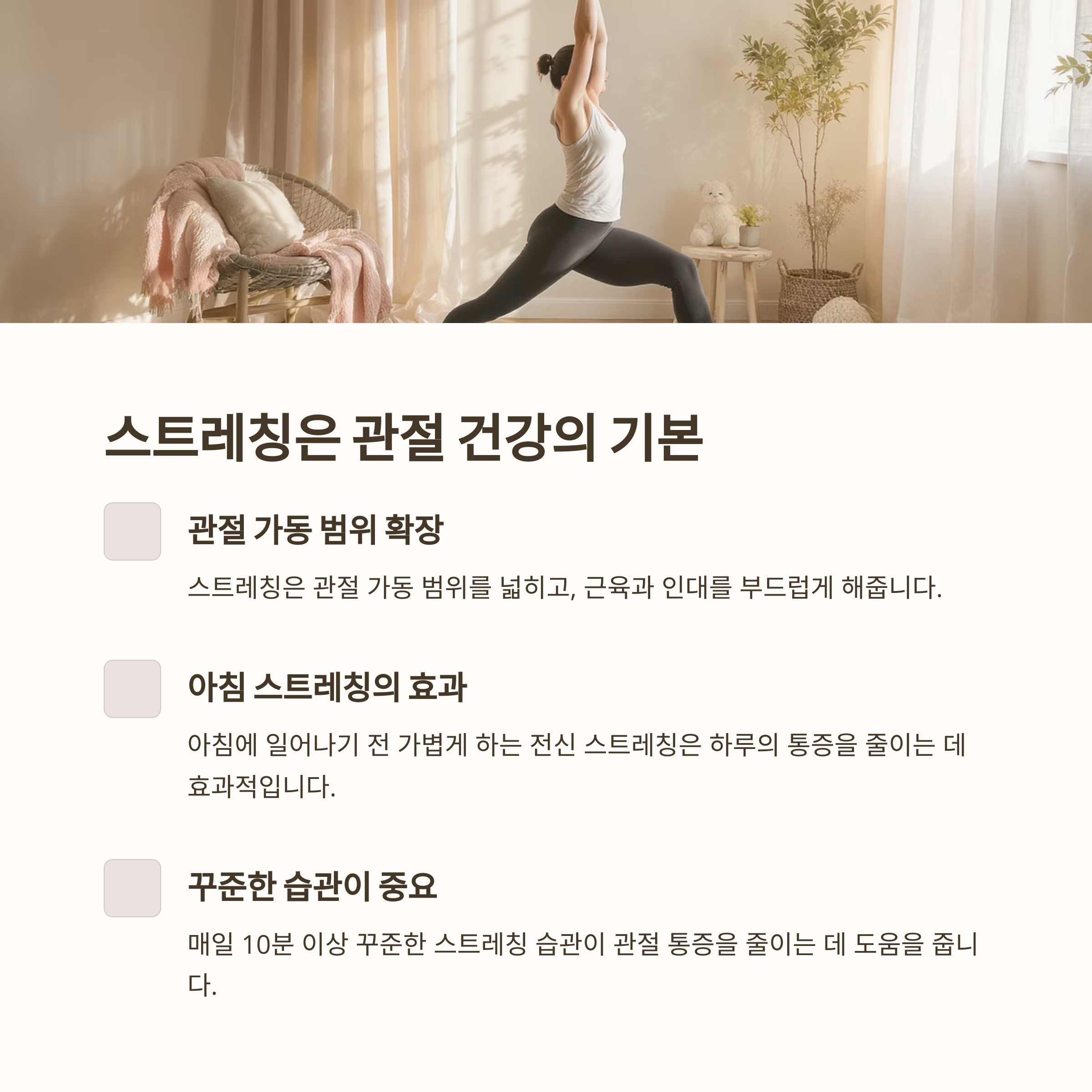 매일 10분 이상 꾸준한 습관이 관절 통증을 줄이는 데 도움을 줍니다.