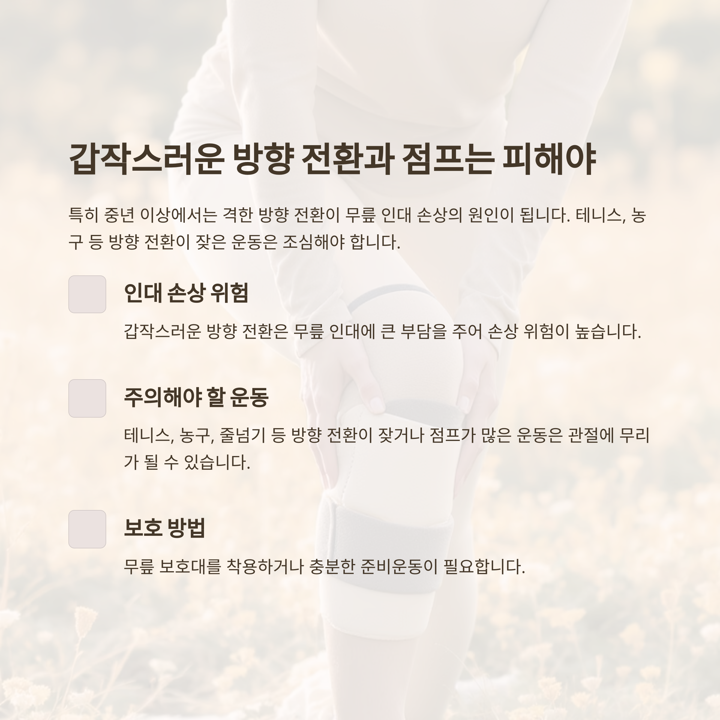 특히 중년 이상에서는 격한 방향 전환이 무릎 인대 손상의 원인이 됩니다.