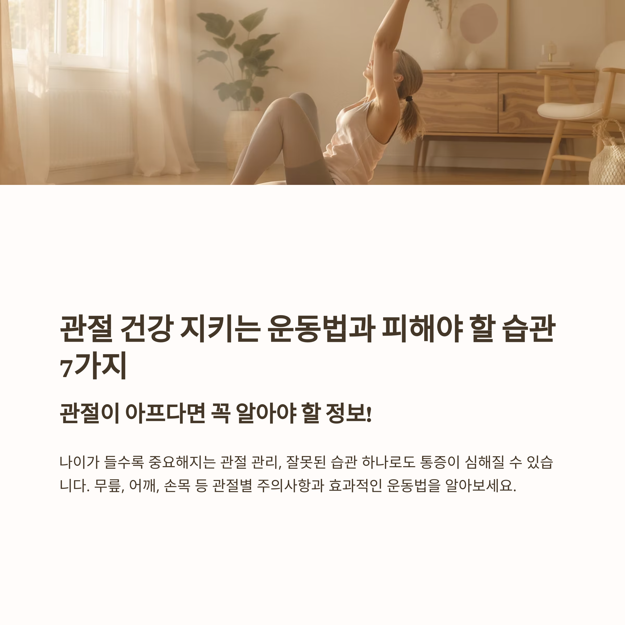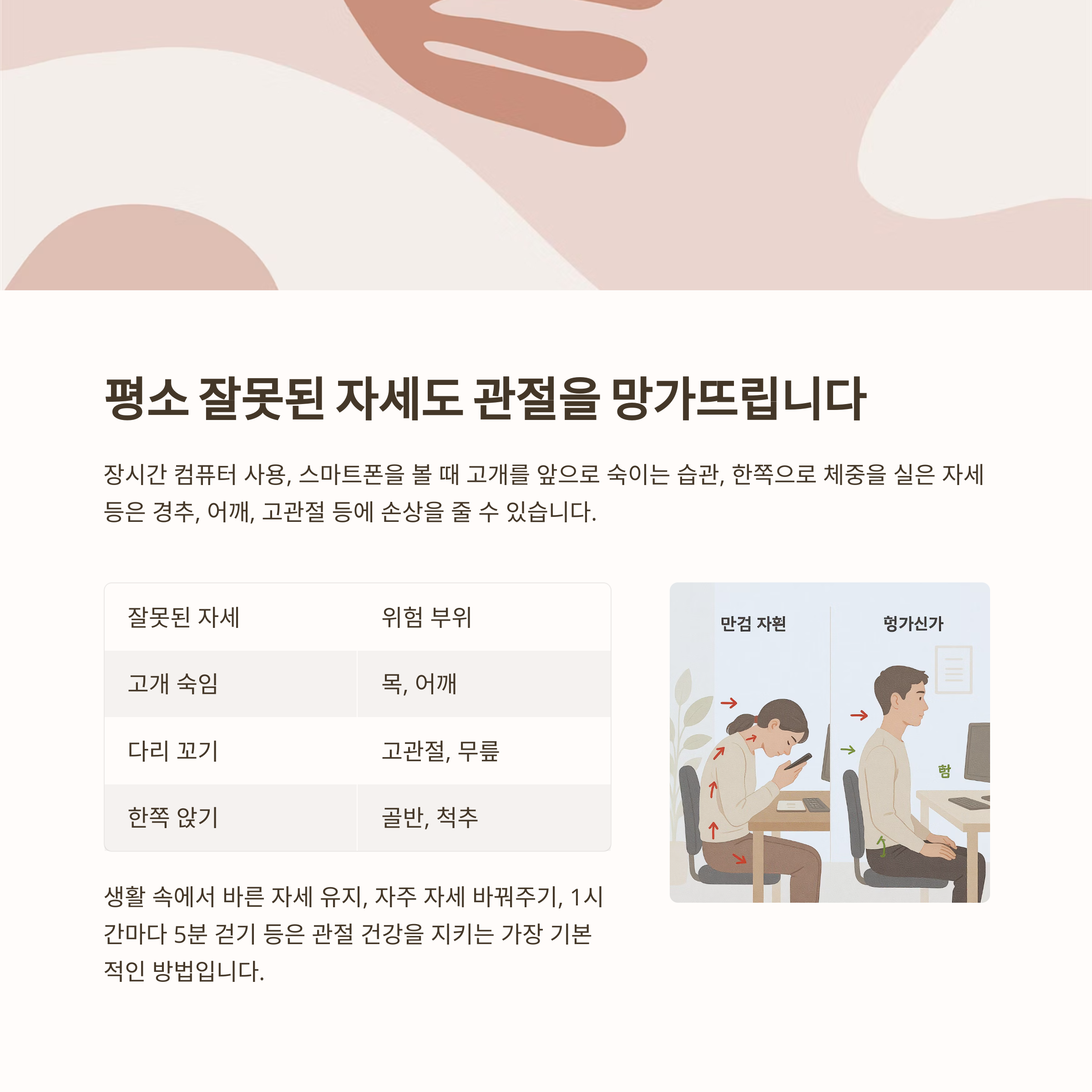 관절은 나이가 들수록 관리가 중요해지며, 잘못된 습관 하나로도 통증이 심해질 수 있습니다.