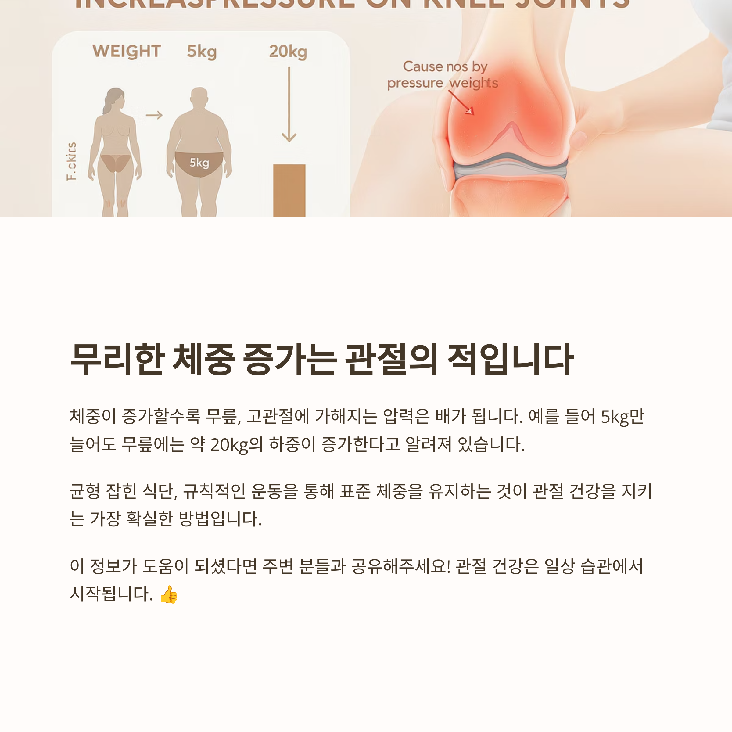 예를 들어 5kg만 늘어도 무릎에는 약 20kg의 하중이 증가한다고 알려져 있습니다.
