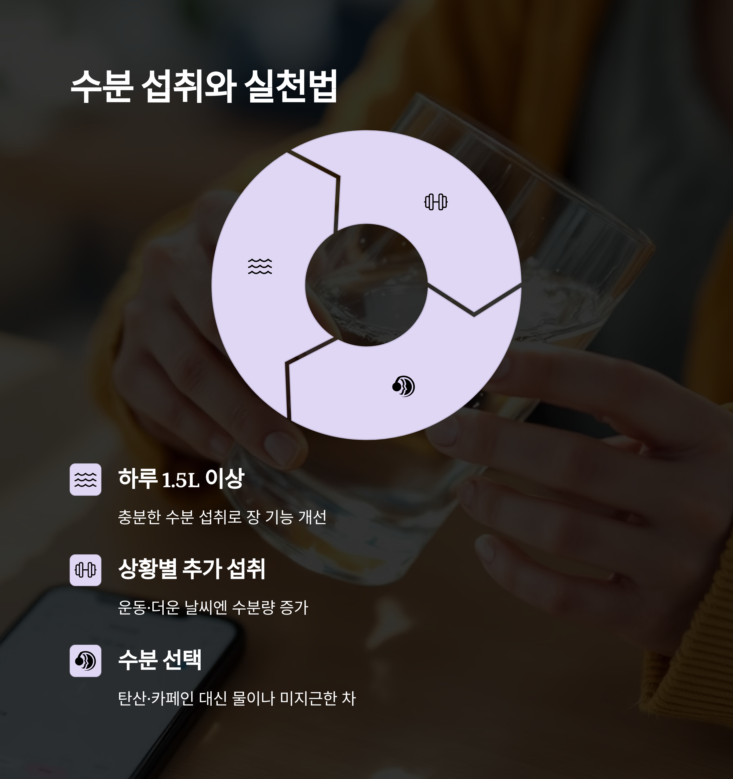 순수한 물, 보리차, 이온음료 등을 중심으로 수분을 보충해야 합니다.