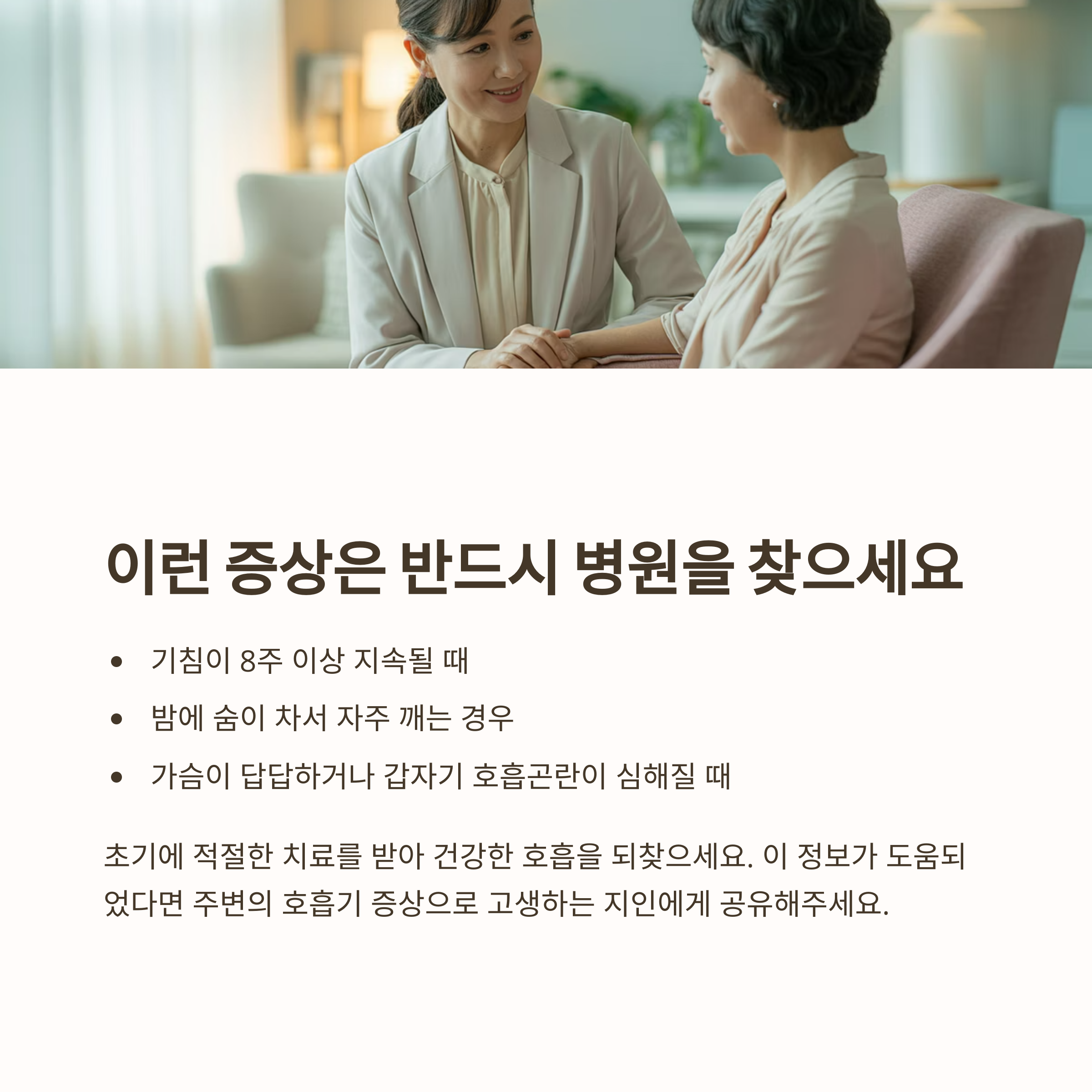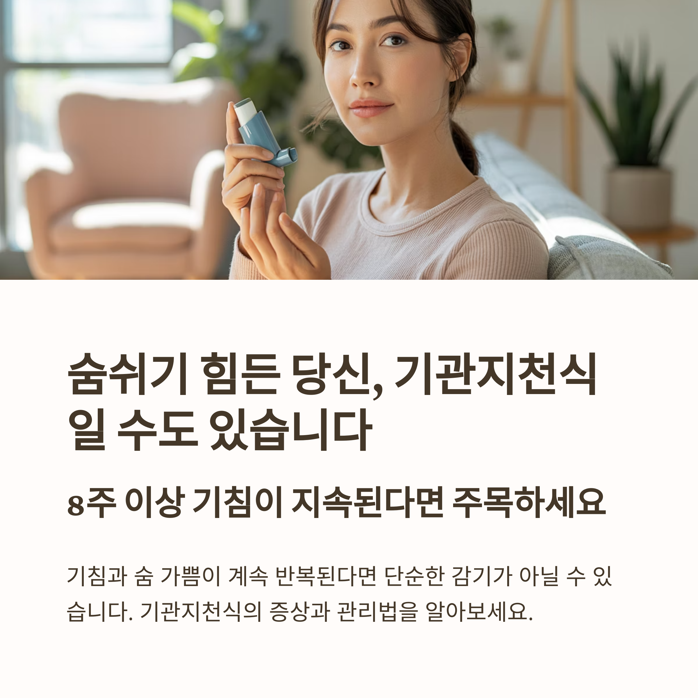 기침이나 숨 가쁨 등의 증상이 반복적으로 나타나는 대표적인 호흡기 질환입니다.