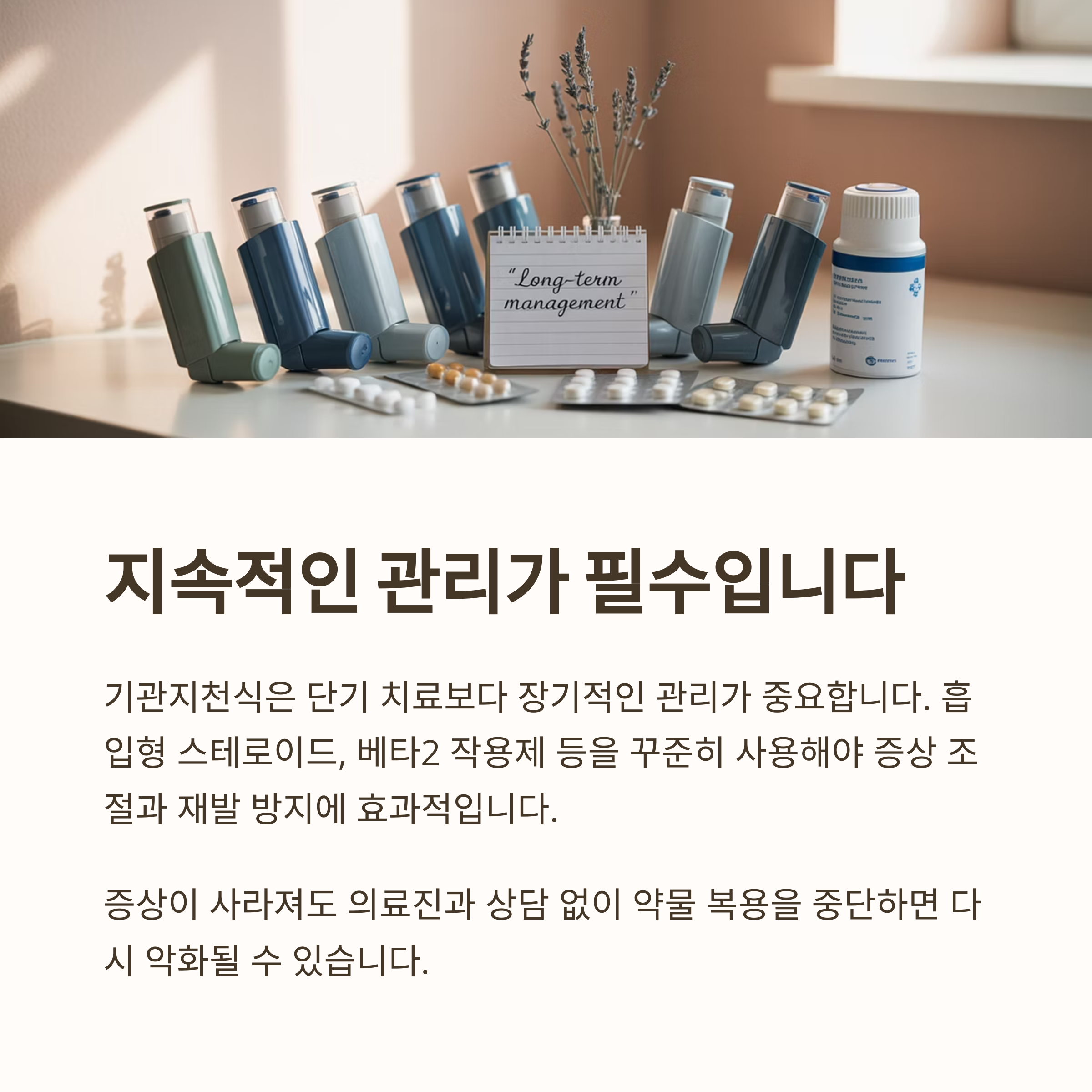 흡입형 스테로이드, 베타2 작용제 등의 약물을 꾸준히 사용하는 것이