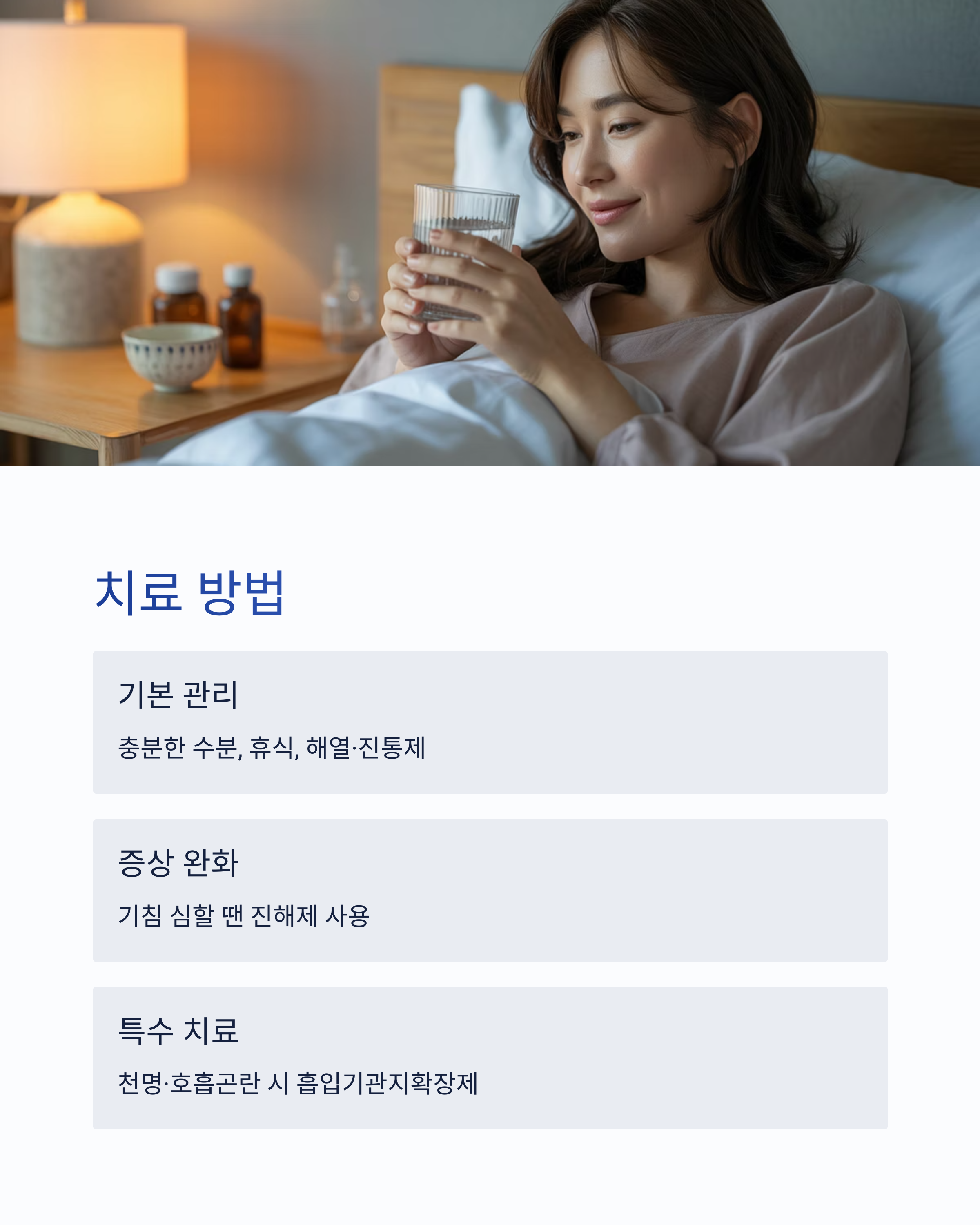치료는 증상 완화 중심, 항생제는 제한적으로 사용됩니다