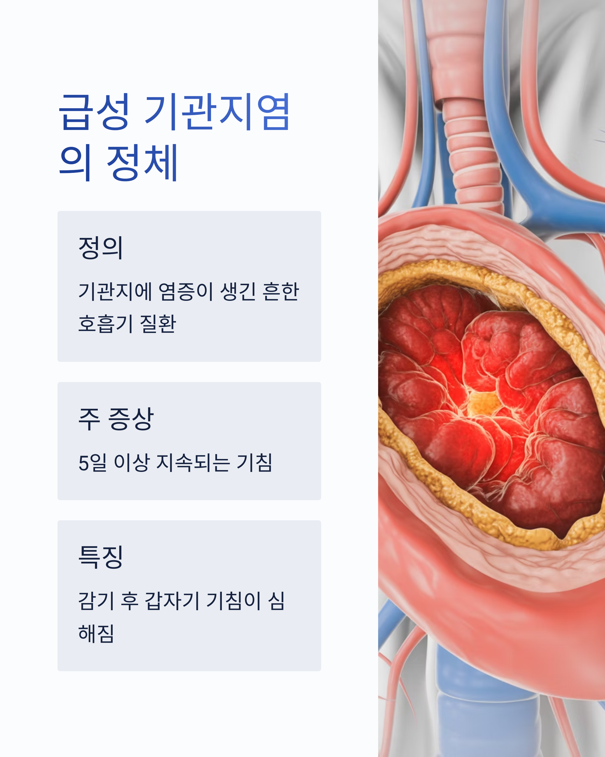 급성 기관지염은 대개 바이러스 감염으로 시작되며, 드물게 세균이 원인이 됩니다.