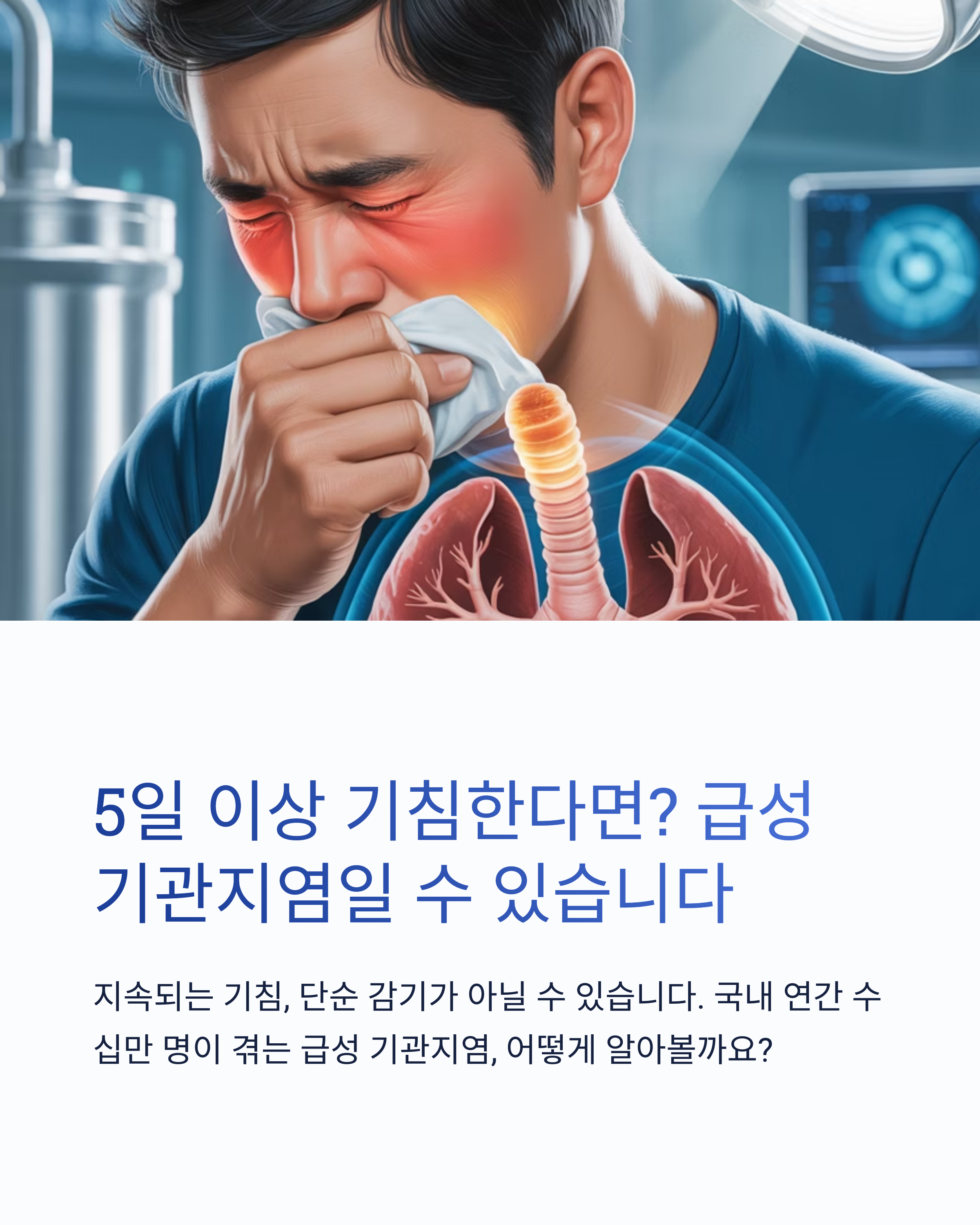급성 기관지염은 기침이 주된 증상인 흔한 호흡기 질환입니다. 감기처럼 시작되지만, 5일 이상 기침이 지속되거나 가래, 호흡곤란이 동반되면 단순 감기와 구분해 치료가 필요합니다. 이 글에서는 급성 기관지염의 원인, 진단과 치료, 예방 방법과 함께 실제 발생 현황과 추천 병원 정보까지 상세히 안내드립니다.