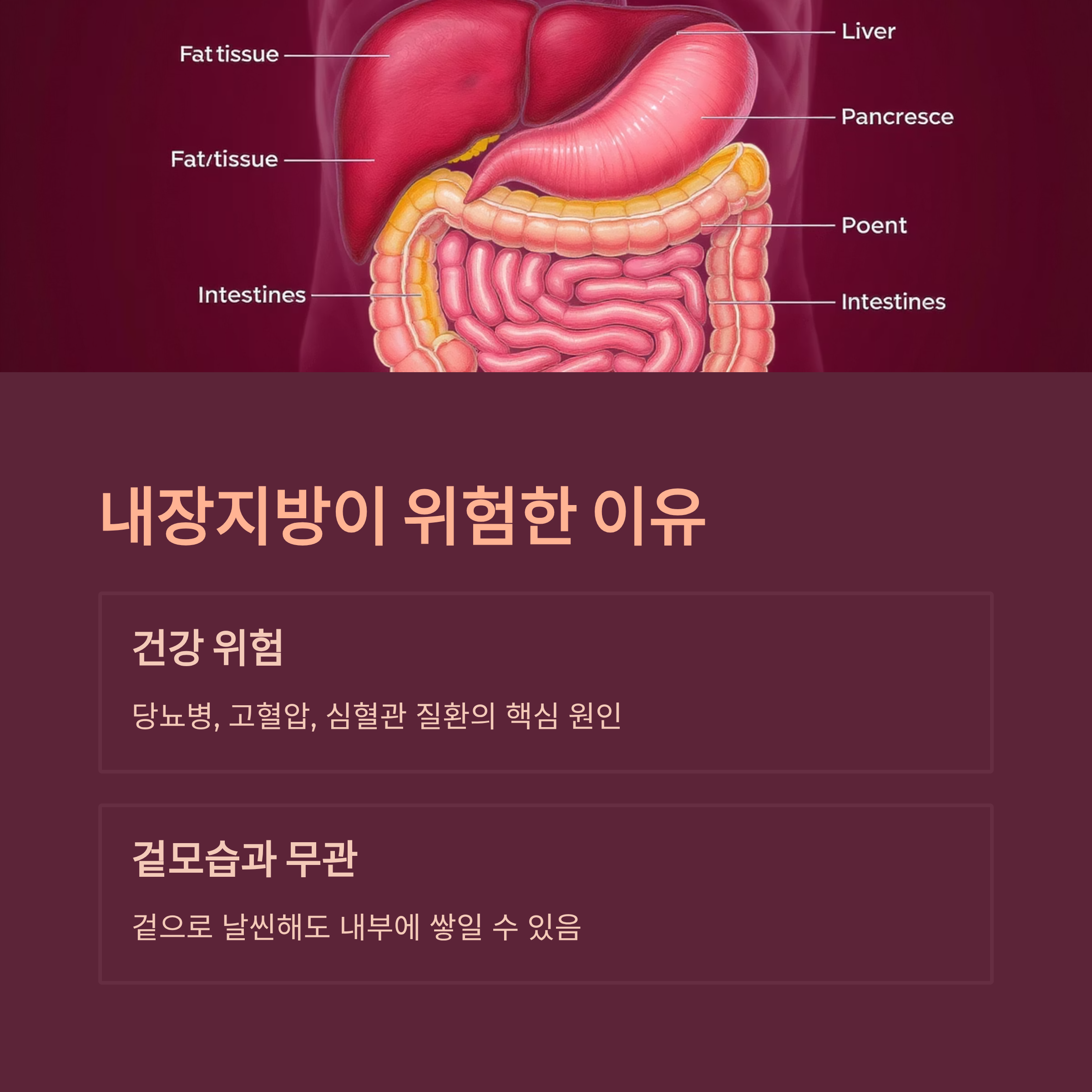 겉으로는 날씬해 보여도 건강을 위협하는 내장지방은 쉽게 빠지지 않습니다. 체중보다 중요한 것이 ‘내장지방 관리’라는 말이 있을 정도로, 이 지방은 당뇨병, 고혈압, 심혈관 질환의 핵심 원인으로 꼽힙니다. 이번 글에서는 내장지방을 집중 공략할 수 있는 식단, 운동, 생활습관 루틴을 구체적으로 소개하겠습니다.