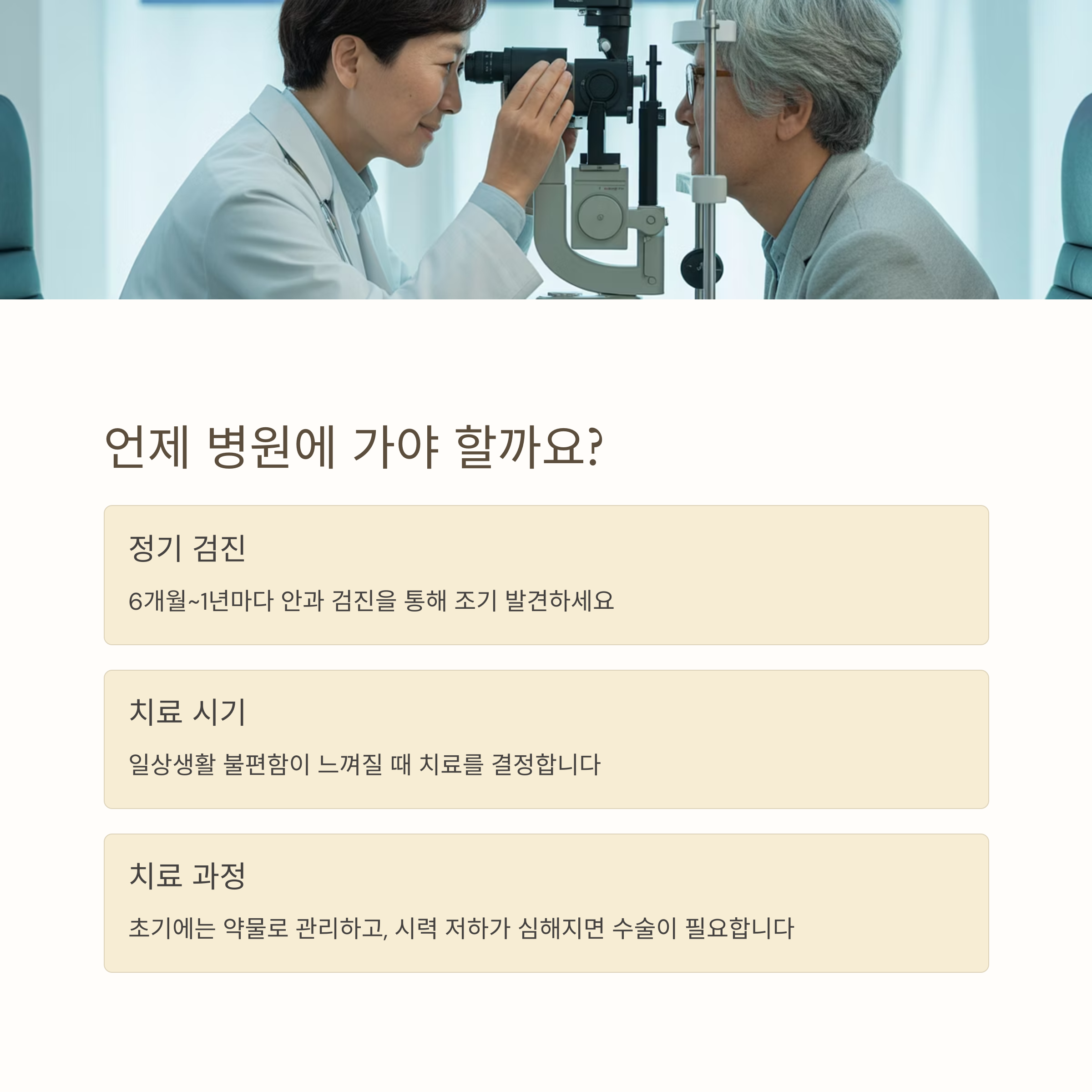 조기 진단과 정기적인 관리를 통해 진행을 늦추고, 수술을 통해 시력을 회복할 수 있습니다.