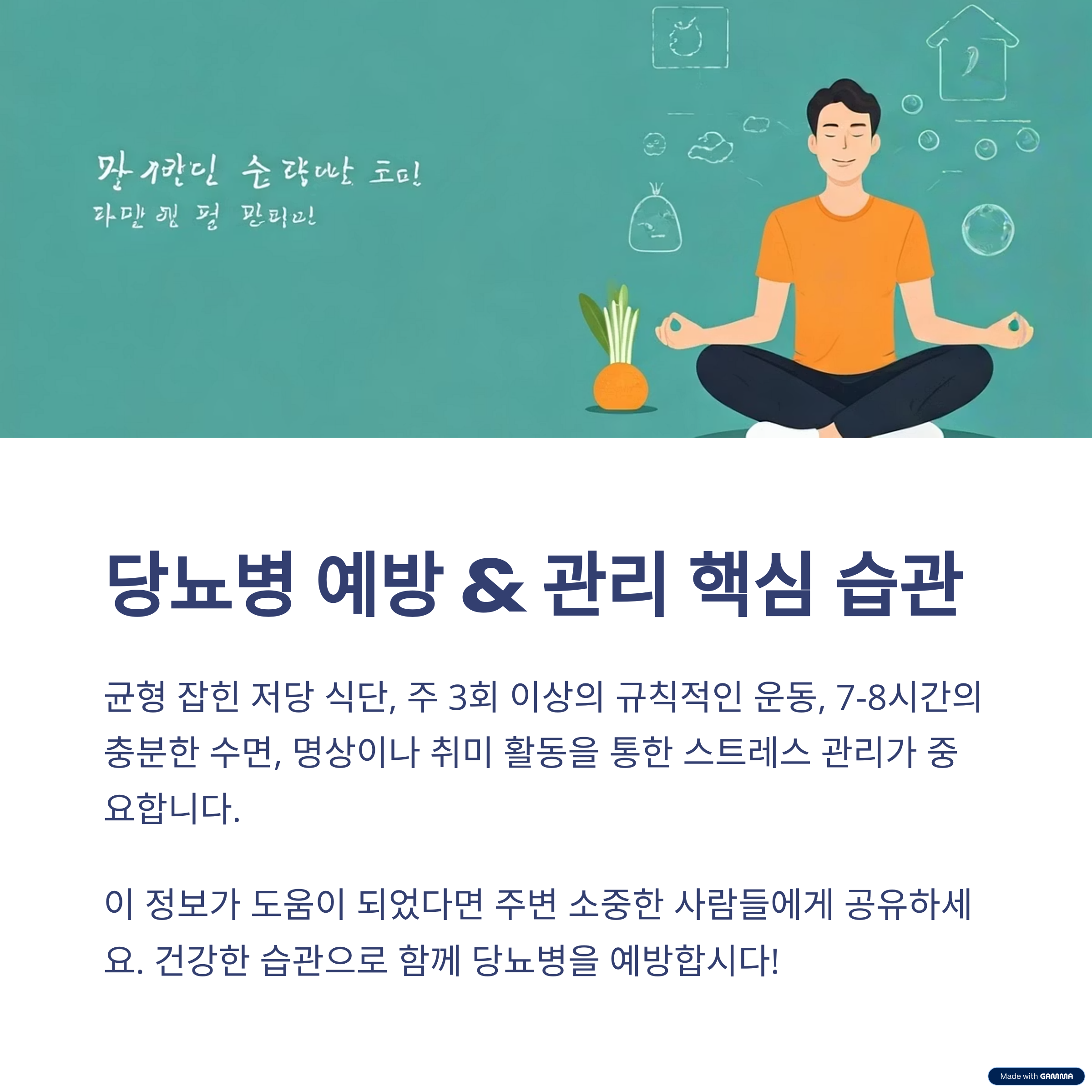 올바른 생활습관은 당뇨병 예방의 열쇠입니다.