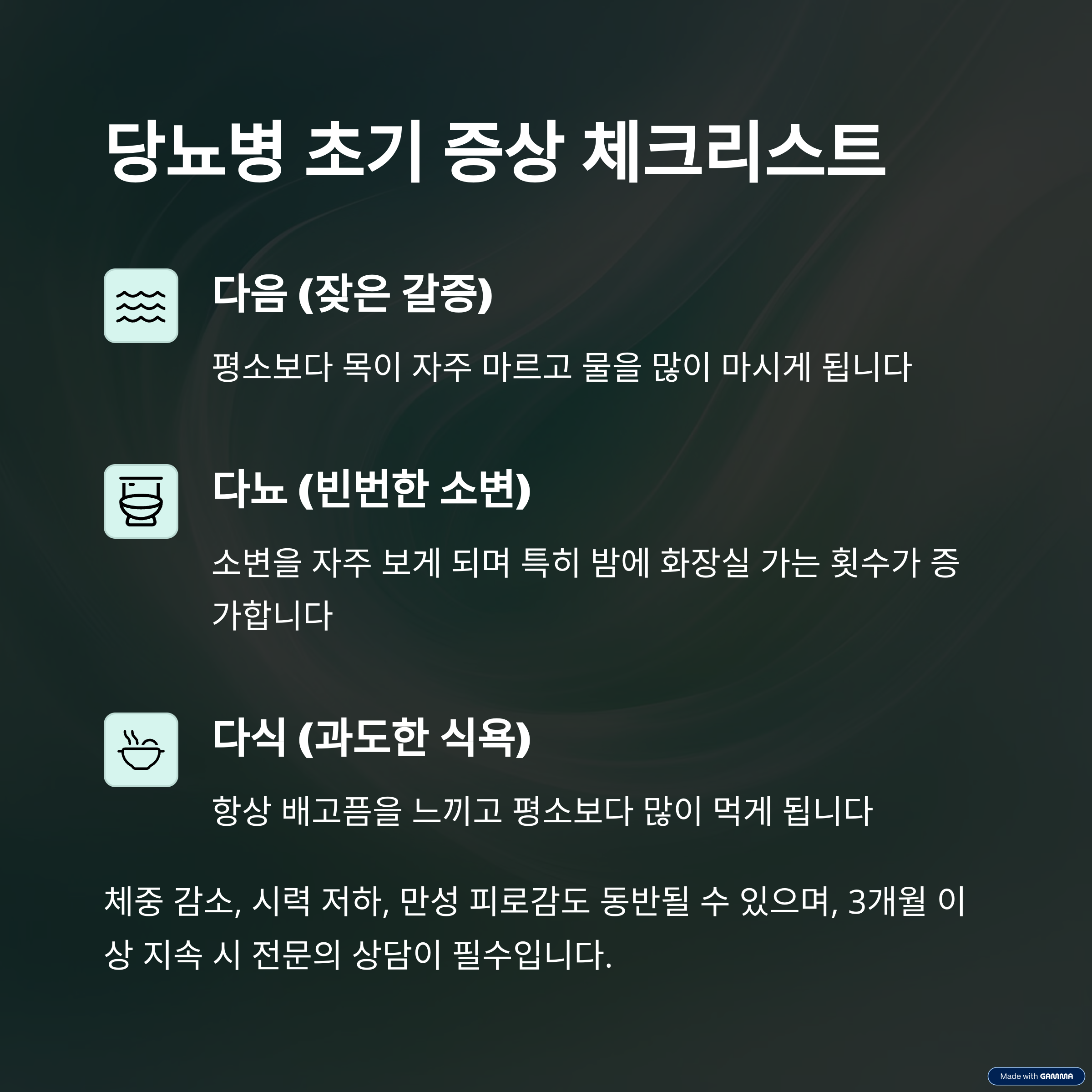 특히 당뇨병은 특정 증상만으로 진단이 어려울 수 있어, 혈당 검사와 의사 상담이 필요합니다.