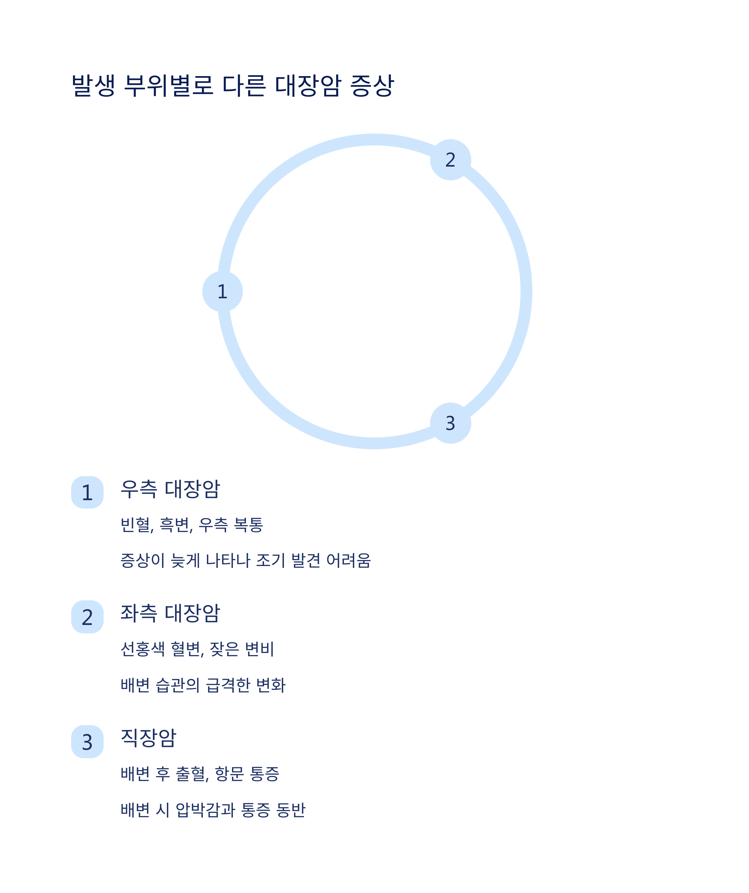 대장암은 발생 위치에 따라 증상이 다르게 나타납니다.