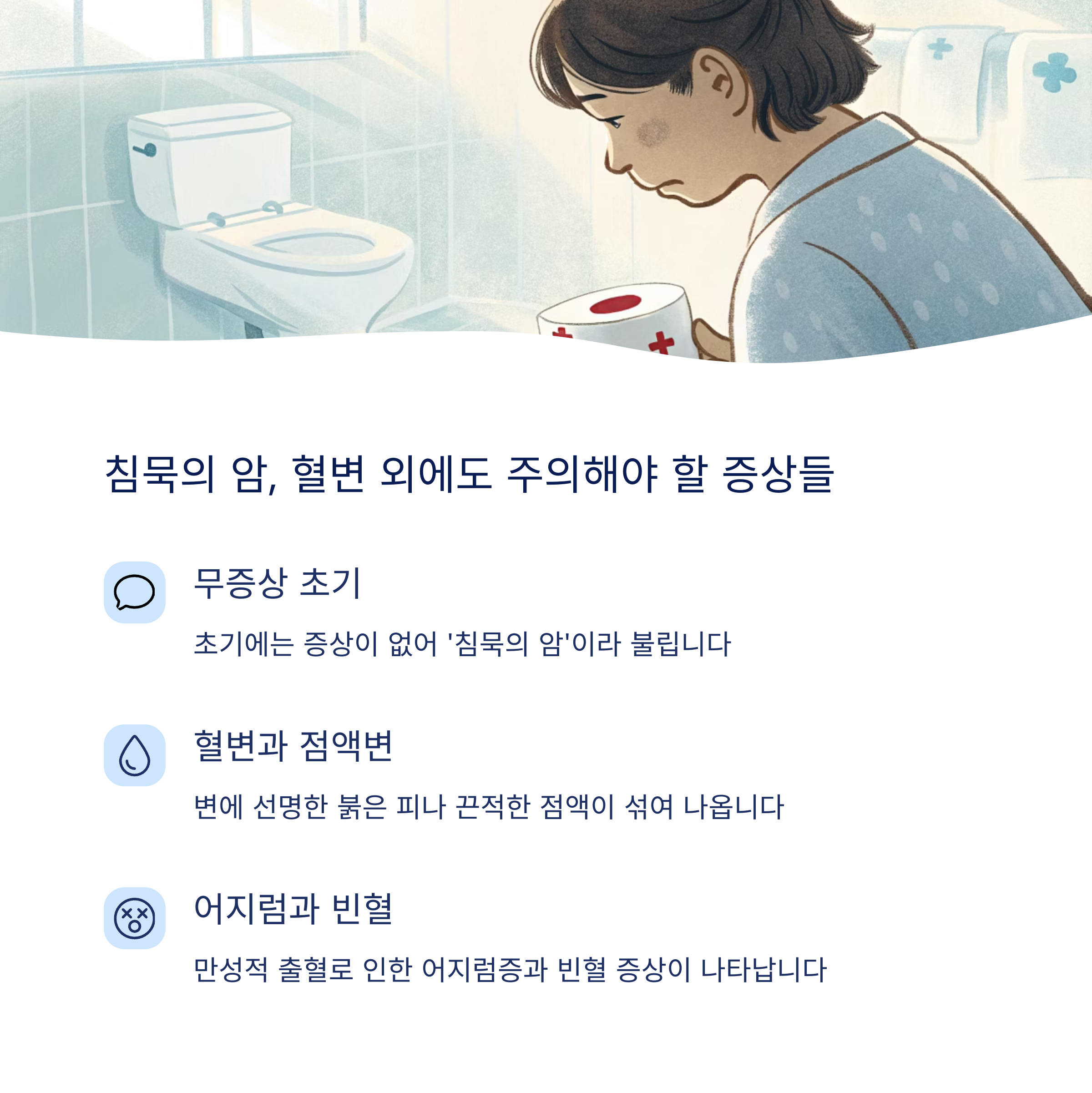 - 직장암: 배변 시 출혈, 점액변, 잔변감