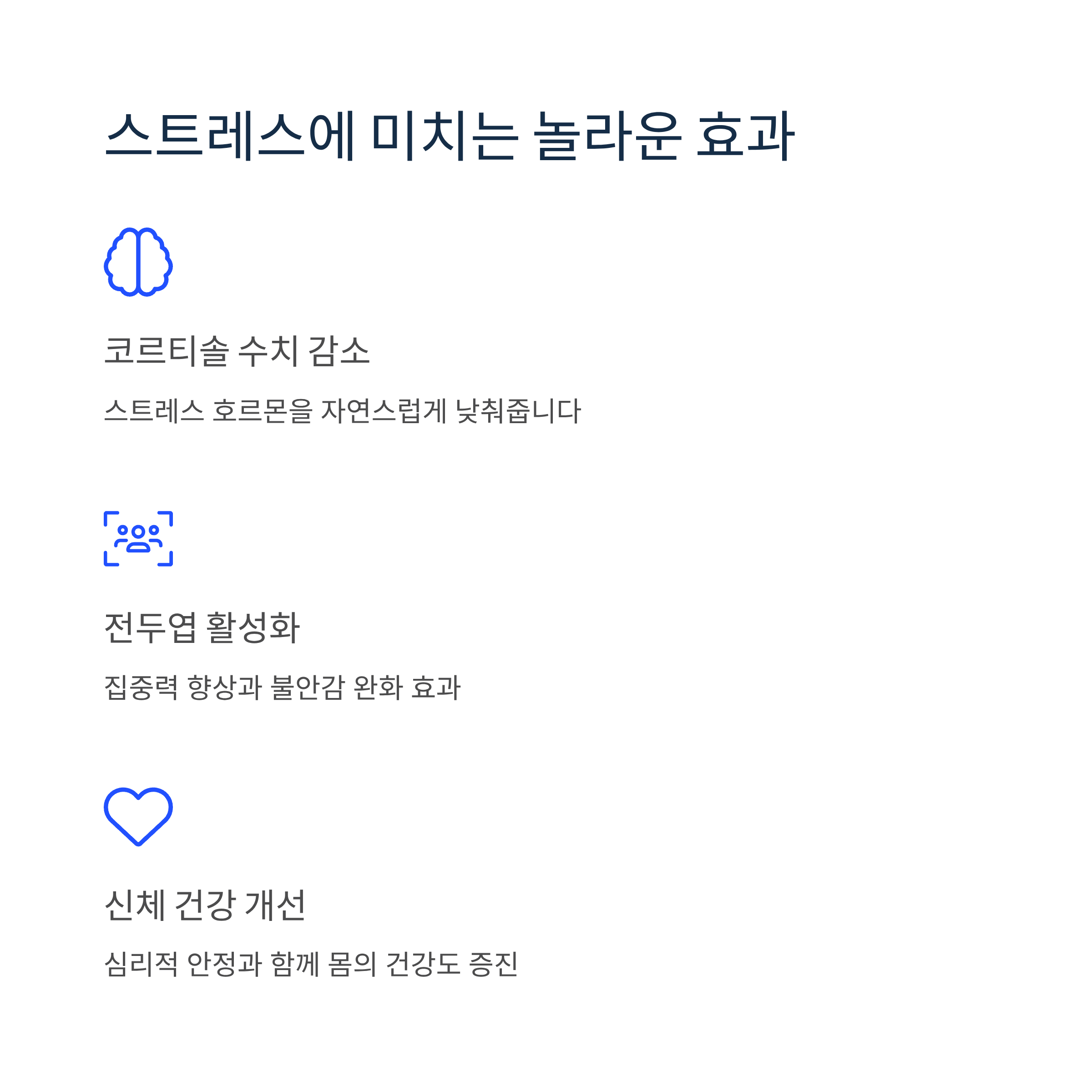 또한 불면증 완화, 혈압 안정화 같은 신체적 건강 개선에도 긍정적인 영향을 줍니다.