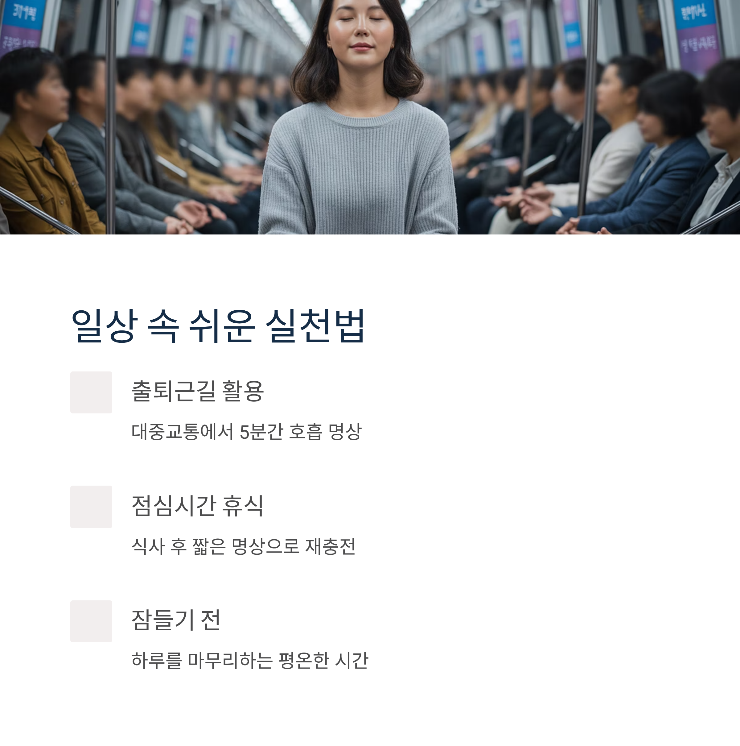 명상은 정해진 장소나 긴 시간 없이도 실천할 수 있습니다.