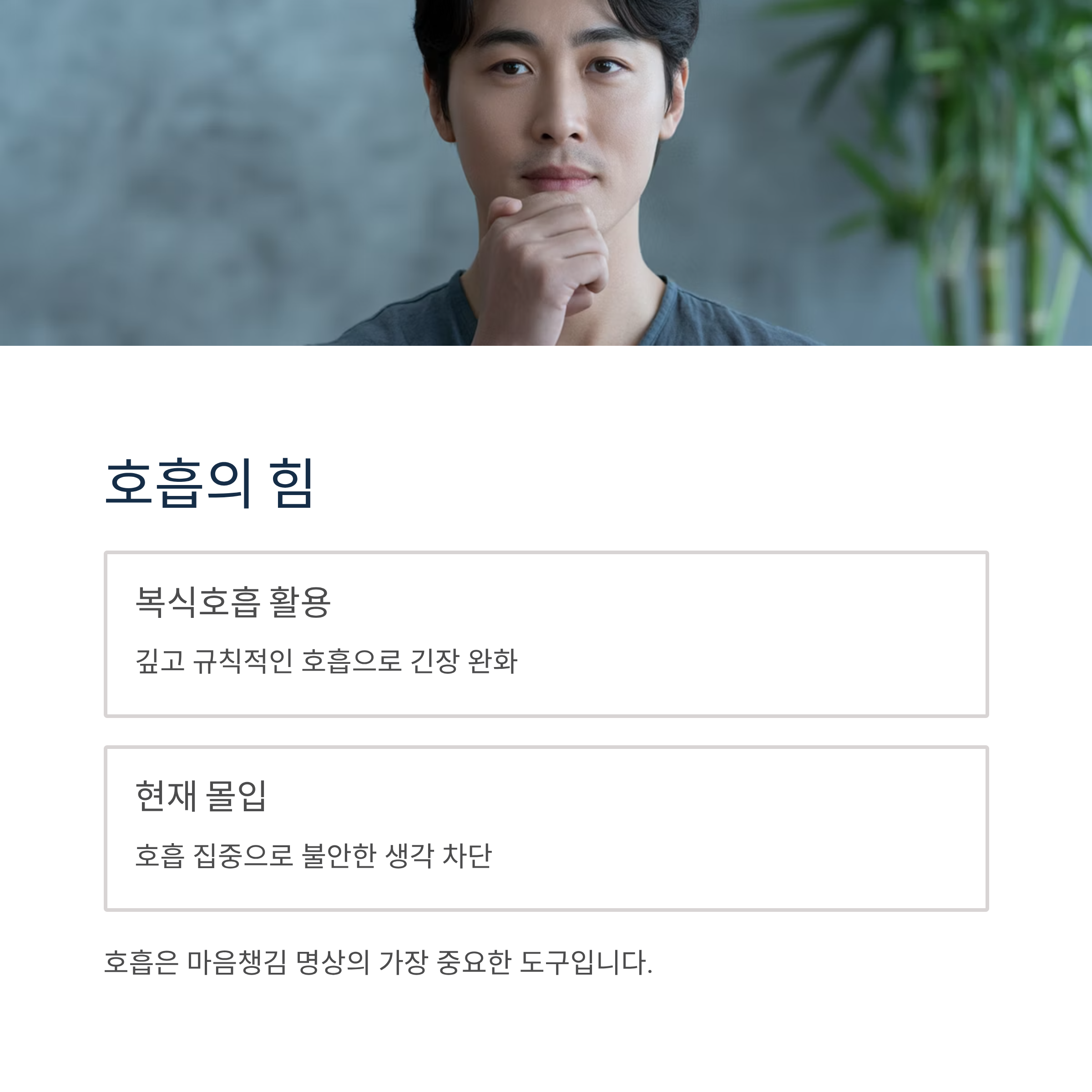 호흡에 집중하면 불안한 생각이 자연스럽게 줄어들고 현재에 몰입할 수 있습니다.