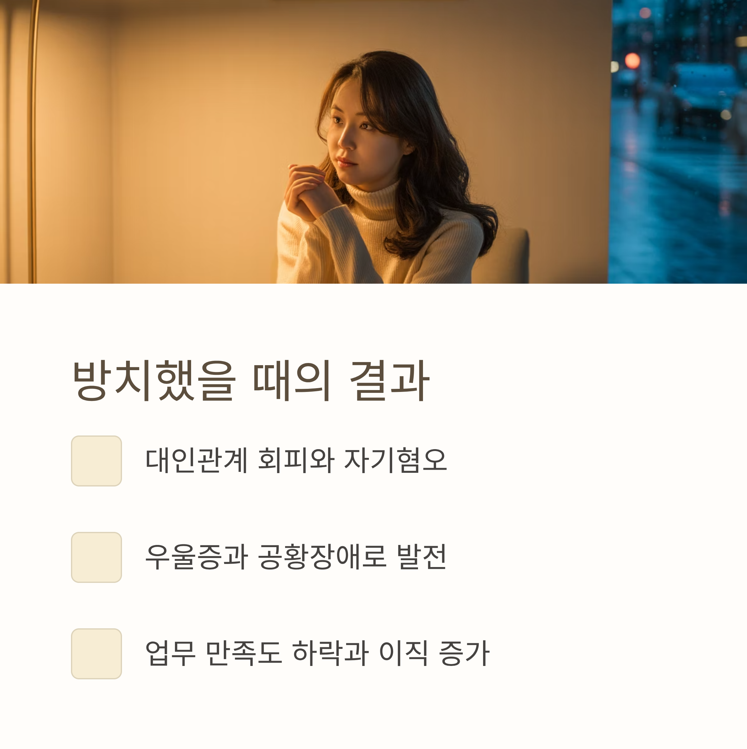 정신적 | 우울감, 불안장애, 무기력, 자기혐오 |