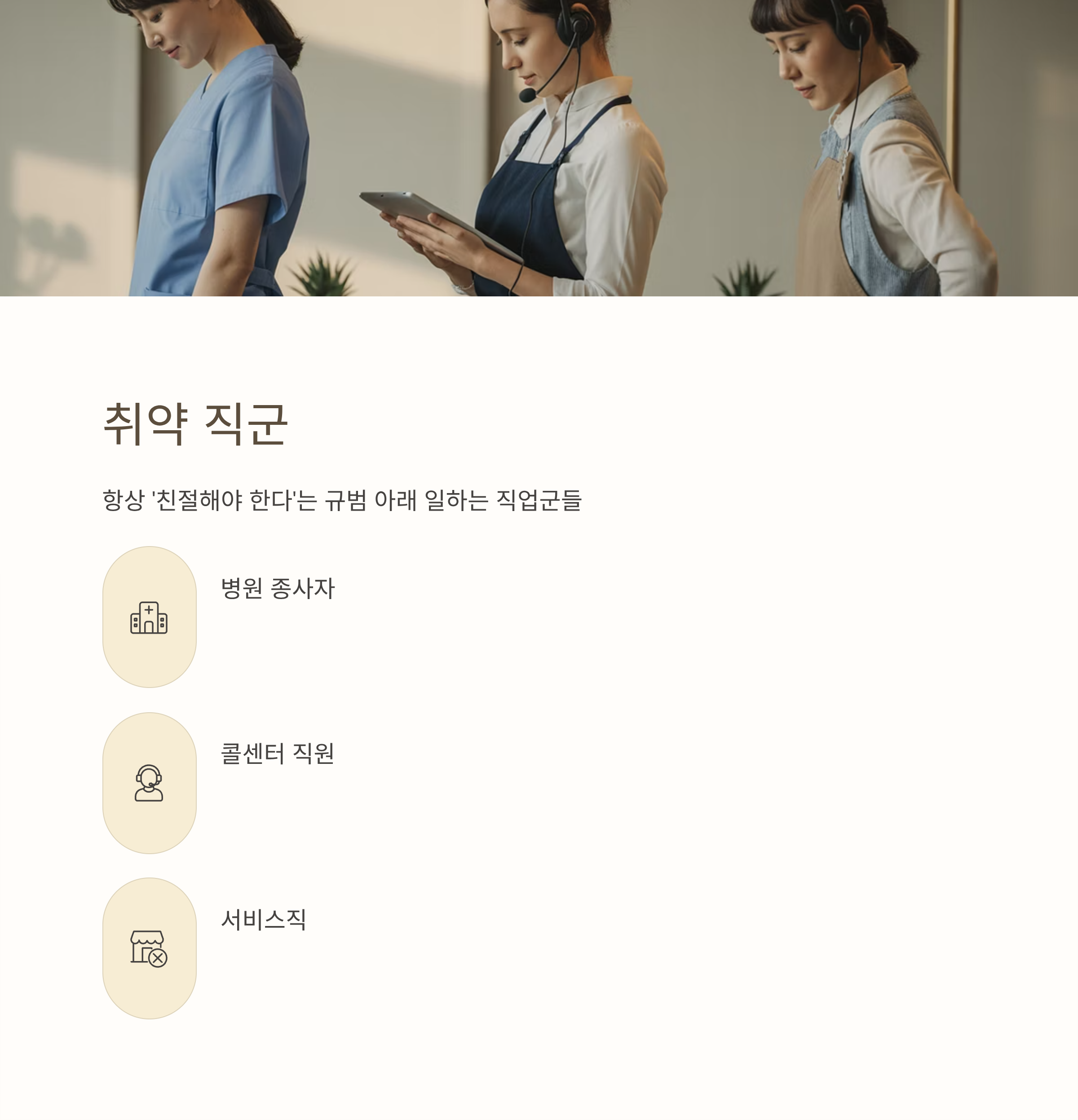 서비스직, 상담직, 병원 및 콜센터 종사자 등은