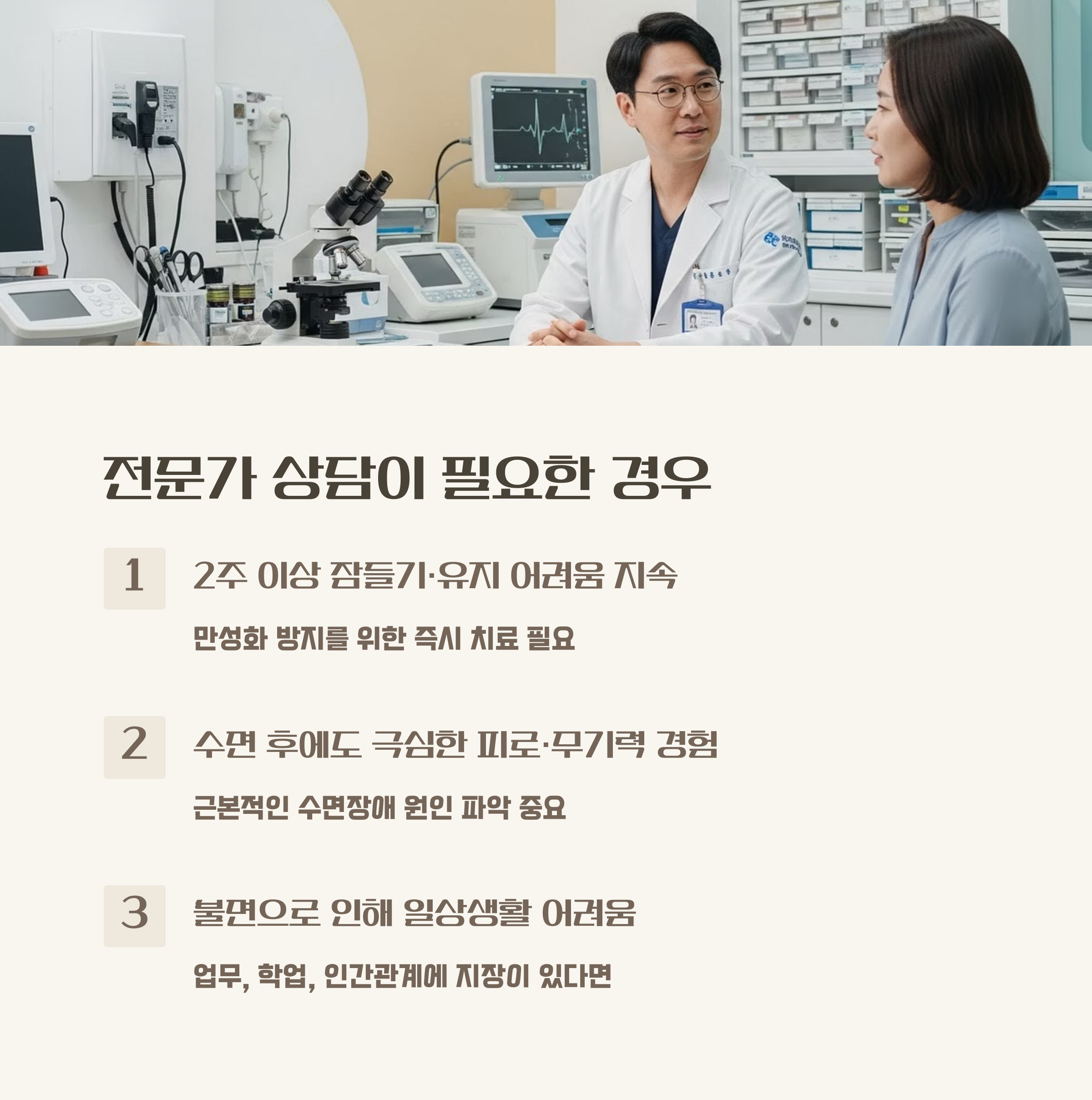 장기적으로는 수면 위생 개선과 인지행동치료가 핵심입니다.