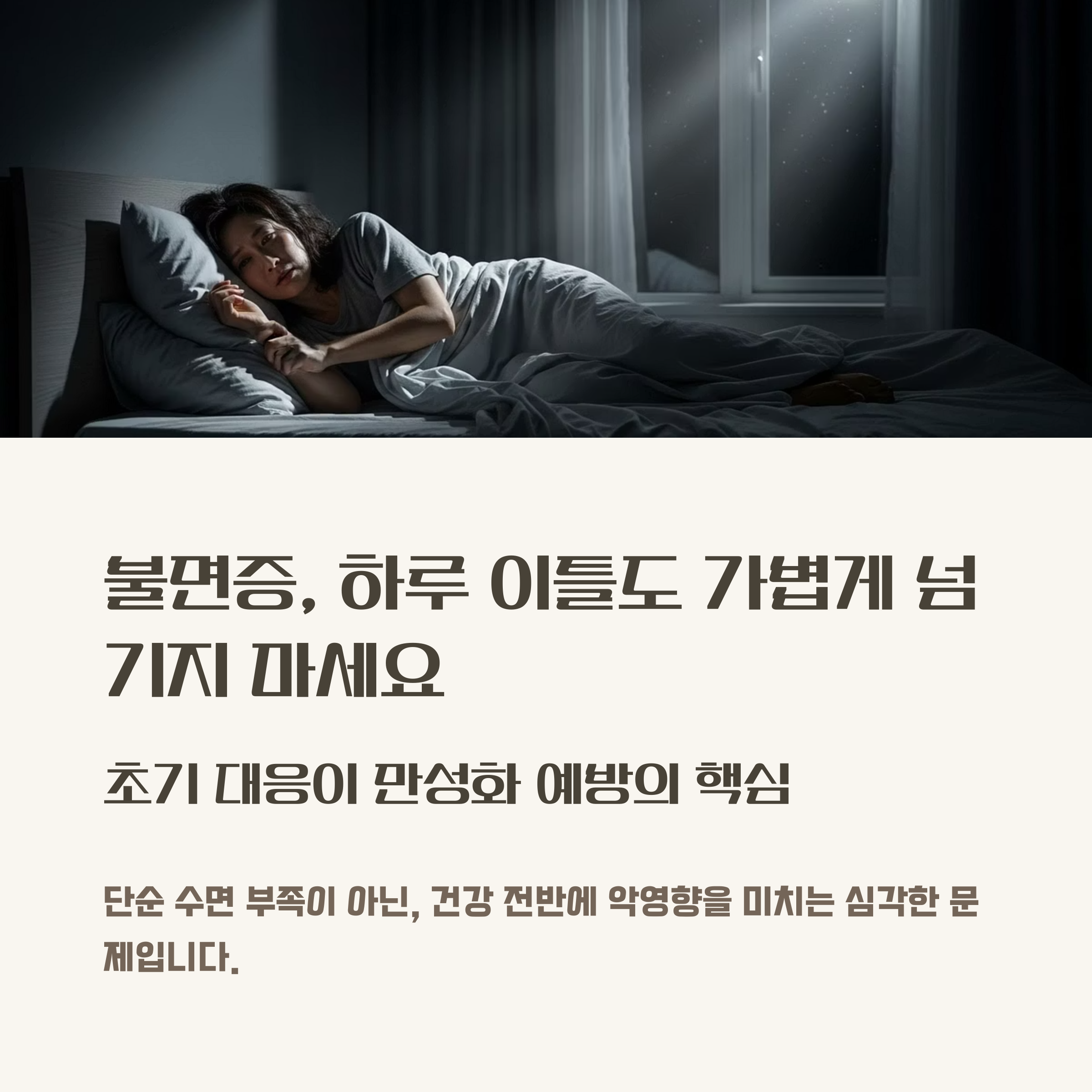 불면증은 단순한 수면 부족을 넘어 삶의 질과 건강 전반에 큰 영향을 미치는 중요한 수면 질환입니다. 특히 짧은 기간이라 해도 반복되거나 원인을 방치하면 만성화로 이어질 수 있어 초기 대응이 핵심입니다.