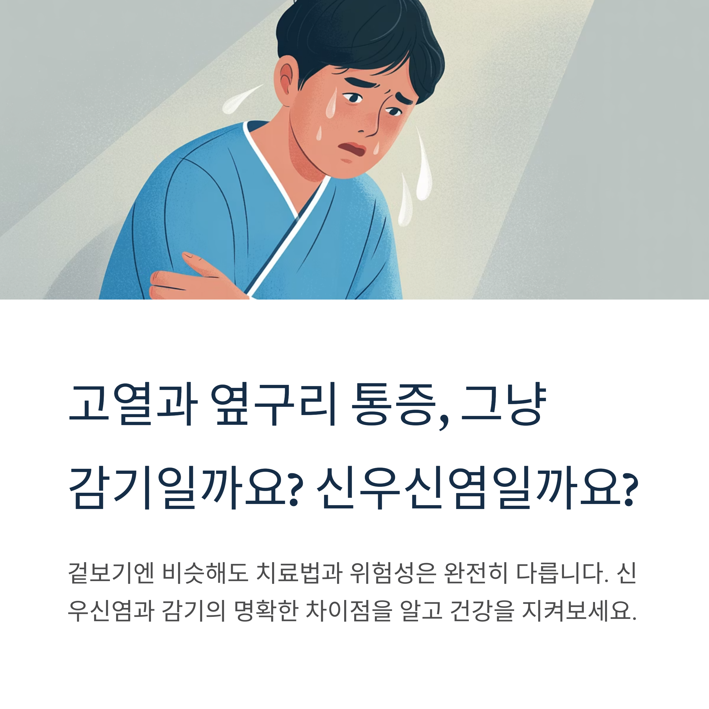 | 주요 증상 | 고열, 오한, 옆구리 통증, 배뇨 이상 | 기침, 콧물, 인후통, 미열 |