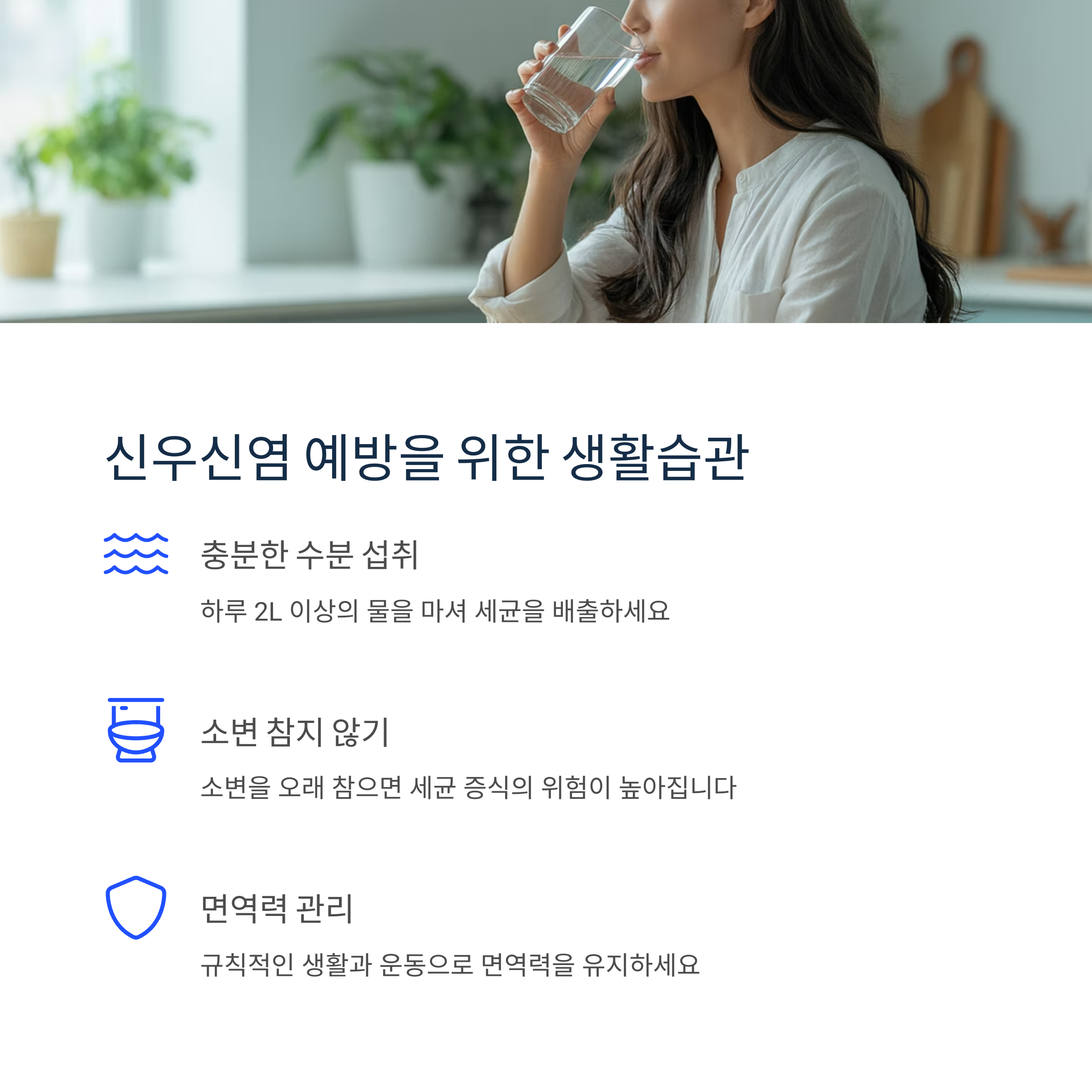적절한 수분 섭취, 소변 참지 않기, 요로 위생 관리, 면역력 유지 등 일상적인 생활 습관 관리가 신우신염을 예방하는 핵심입니다. 특히 요로감염 병력이 있다면 사소한 증상이라도 방치하지 말고 빠르게 조치하는 것이 재발을 막는 길입니다.