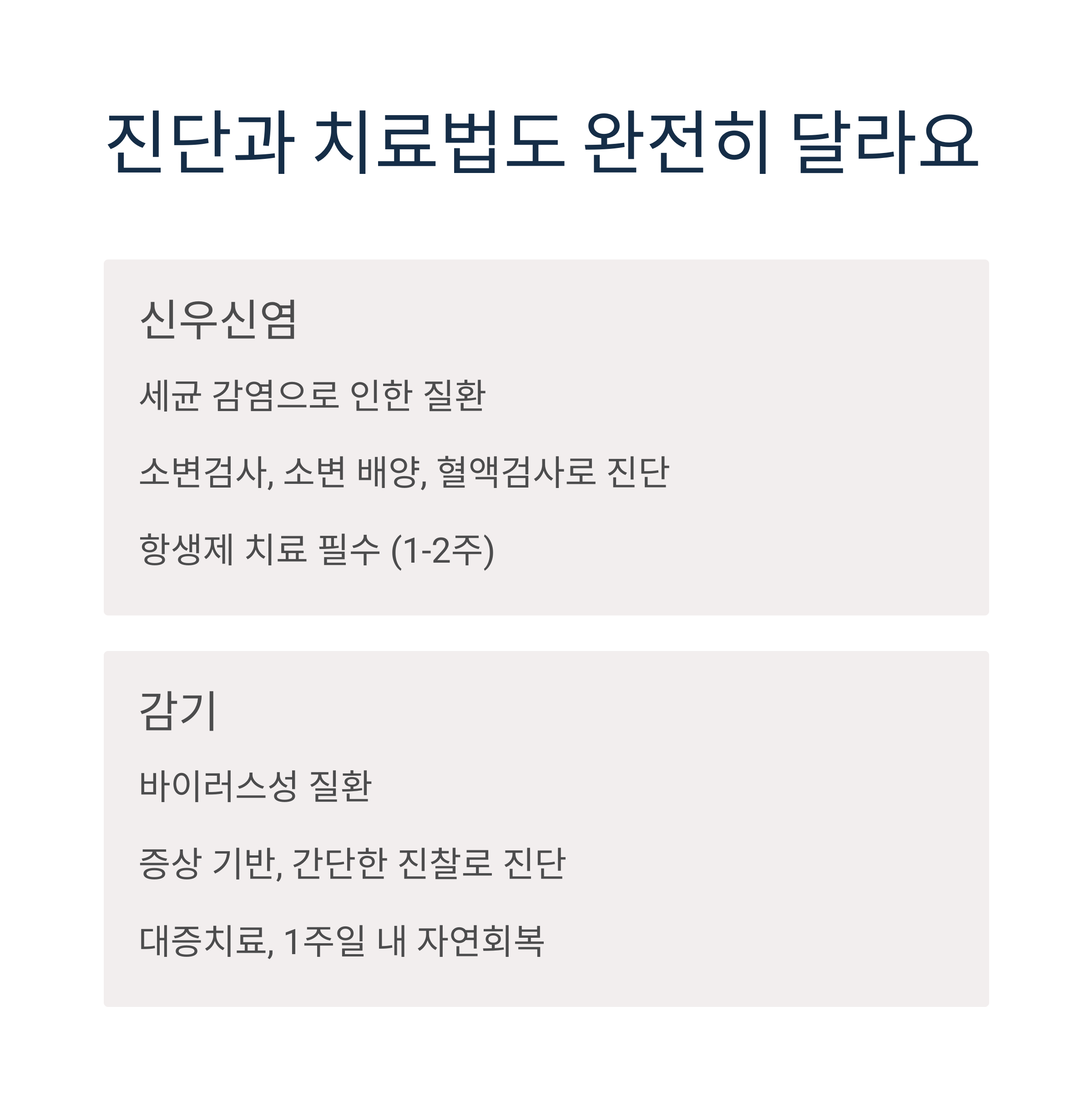 신우신염은 세균 감염으로 인해 발생하기 때문에, 원인을 제거하려면 항생제 치료가 필수입니다. 반면 감기는 바이러스성 질환으로 항생제가 효과가 없으며, 대부분 1주일 이내 자연 회복됩니다. 감기처럼 생각하고 약국에서 일반 감기약을 먹으면 병을 키울 수 있습니다.