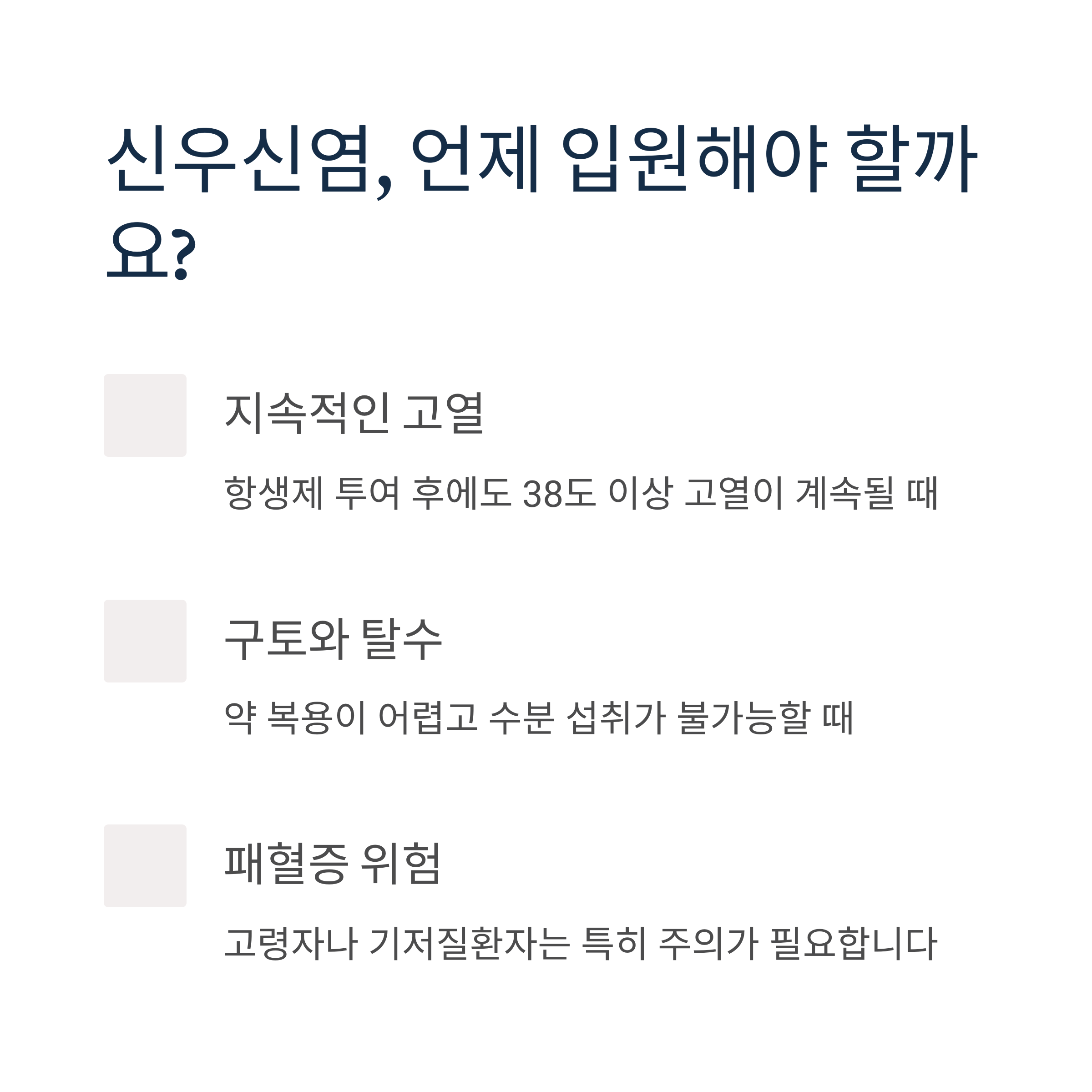 신우신염은 조기 진단 시 항생제만으로도 외래 치료가 가능하며, 보통 1~2주면 증상이 호전됩니다. 하지만 고열이 지속되거나, 구토로 약 복용이 어려운 경우, 패혈증으로 진행 가능성이 높을 땐 반드시 입원 치료가 필요합니다. 고령자나 기저질환자가 특히 주의해야 합니다.