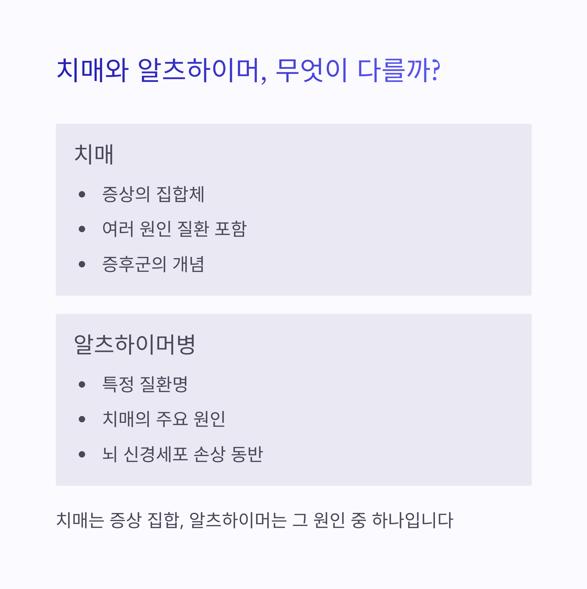 | 원인 | 알츠하이머병, 혈관성 치매, 파킨슨병 등 다양 | 뇌 신경세포의 점진적 손상·사멸 |