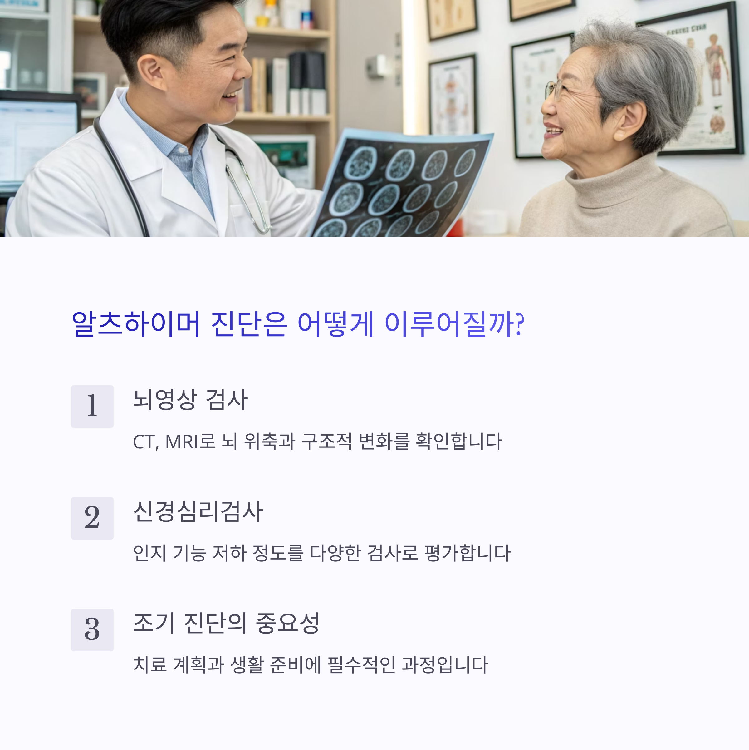 알츠하이머병과 치매는 임상 증상 외에도 뇌영상(MRI, PET)과 신경심리검사 등으로 진단합니다. MRI를 통해 해마(기억 담당 뇌 부위) 위축 여부를 확인하고, PET 스캔으로 뇌 내 단백질(아밀로이드, 타우) 침착 여부를 확인할 수 있습니다. 최근에는 손가락 두드리기 같은 간단한 운동 테스트도 초기 진단에 활용되고 있습니다.