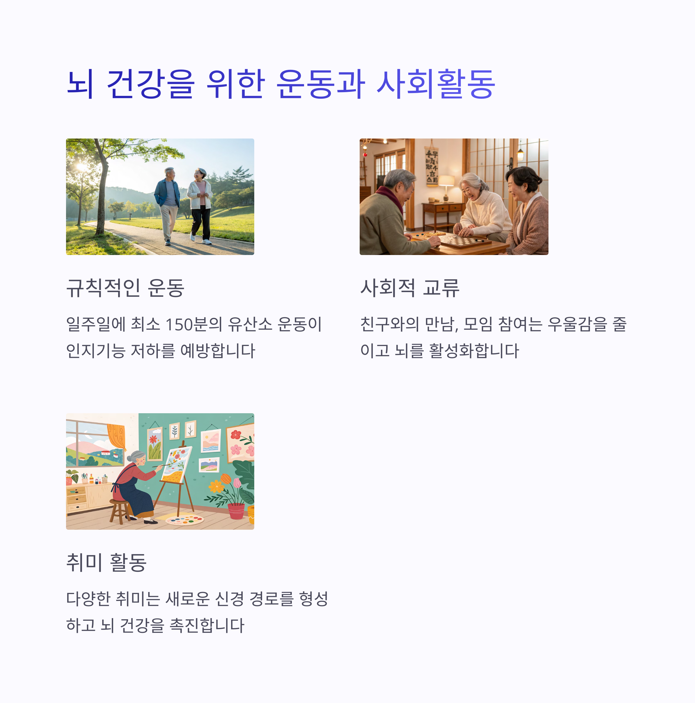 • 규칙적인 유산소 운동: 일주일에 3회 이상, 30분 정도의 걷기, 자전거 타기, 수영 등 유산소 운동이 뇌혈류를 개선하고 인지기능 저하를 늦추는 데 효과적입니다.
