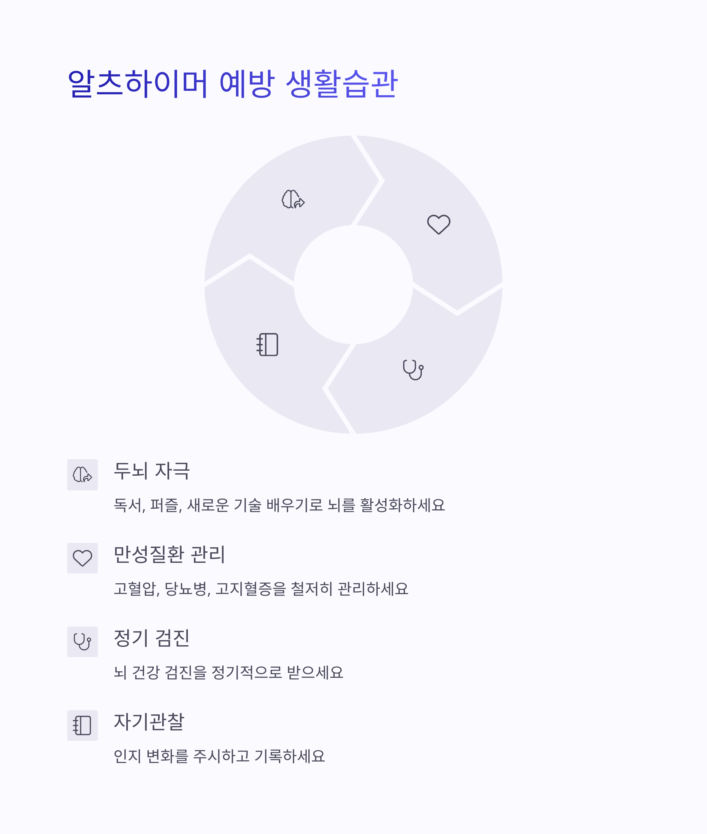 • 금연·절주: 흡연은 뇌 조직 손실과 치매 위험 증가와 연관되어 있으므로 반드시 금연이 필요합니다. 과도한 음주 역시 인지기능 저하를 유발하므로 절주가 권장됩니다.