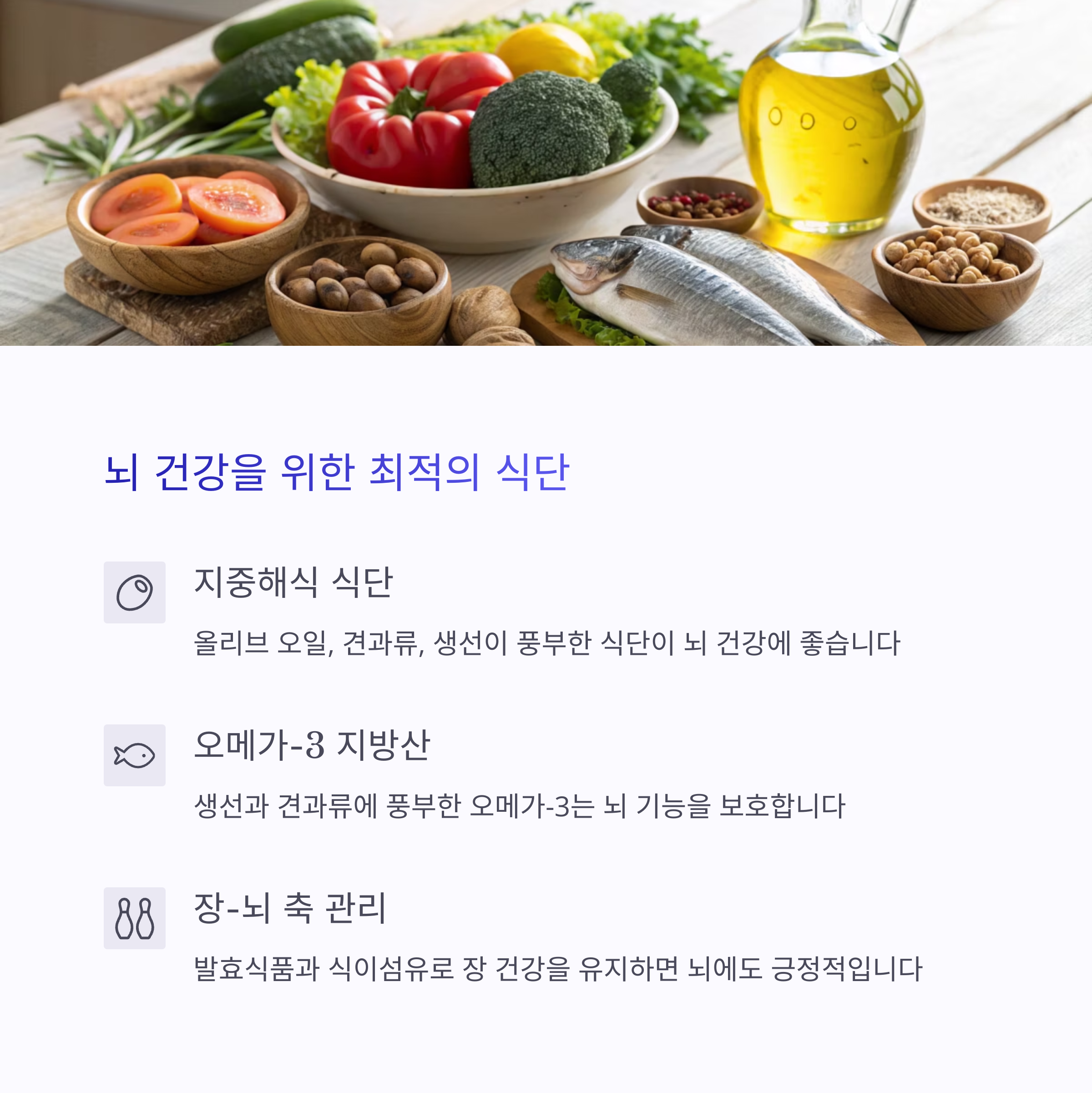 • 건강한 식습관: 지중해식 식단(생선, 채소, 과일, 올리브유, 견과류 등), 오메가-3 지방산, 비타민 E, 녹황색 채소, 해조류 등의 섭취가 뇌 건강에 도움을 줍니다.
