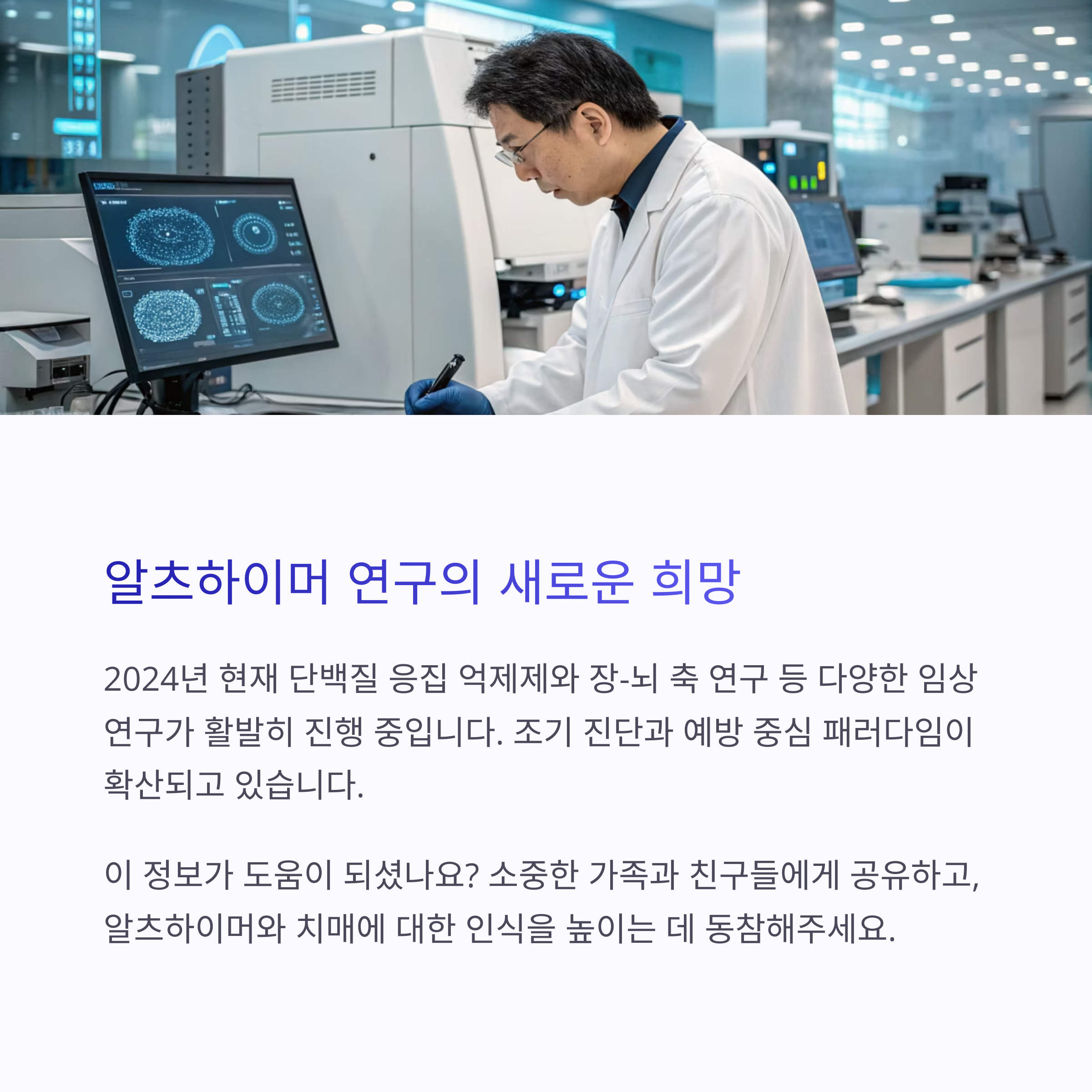 알츠하이머병은 치매를 유발하는 여러 질환 중 가장 흔한 원인 질환입니다. 전체 치매 환자의 약 50~70%가 알츠하이머병에 의한 것으로 추정됩니다. 알츠하이머병은 뇌 신경세포가 점진적으로 손상되고 사멸하는 퇴행성 뇌질환으로, 초기에는 최근 기억 상실이 두드러지며, 진행되면 언어·판단·일상생활 수행 능력, 심지어 보행과 같은 신체 기능까지 저하됩니다.
