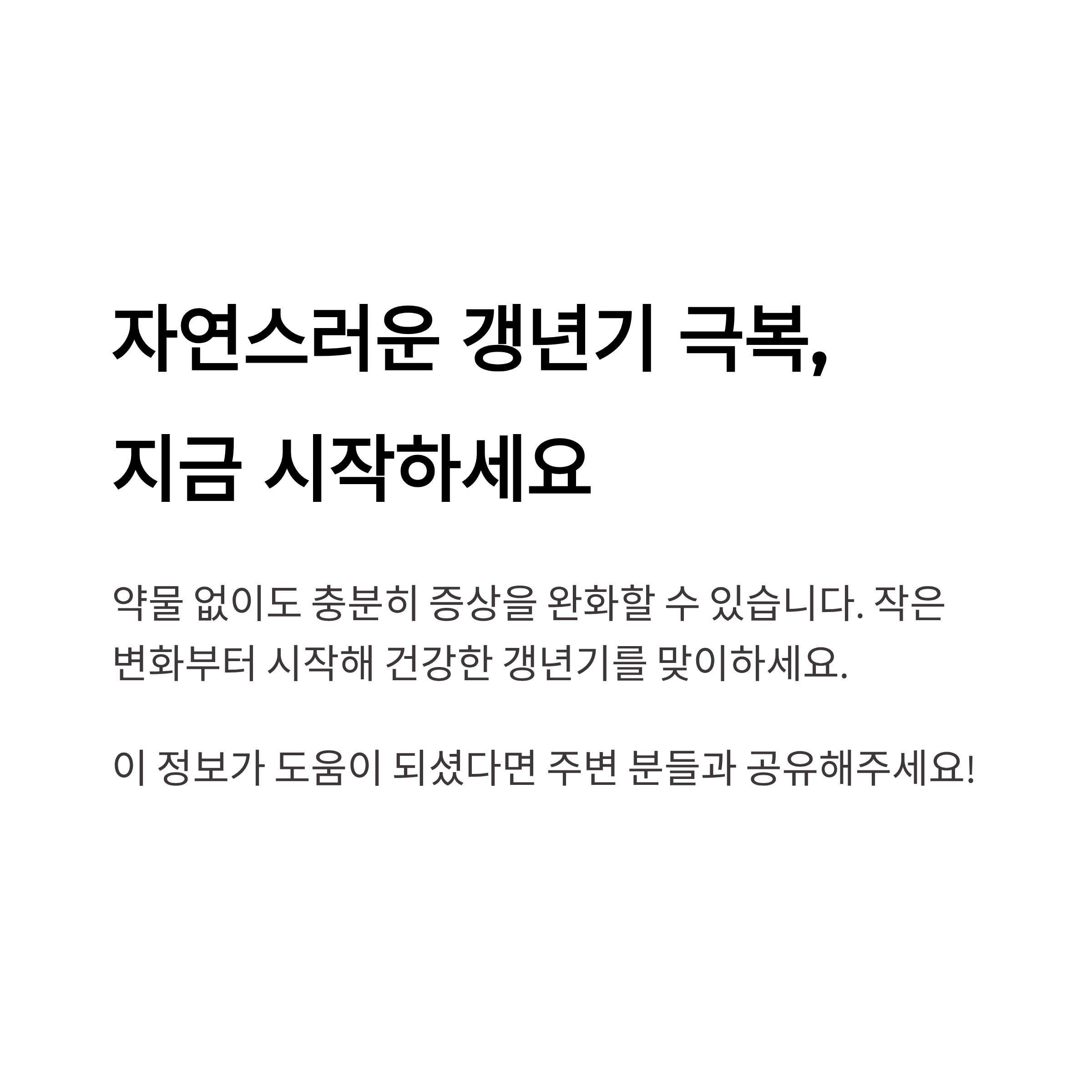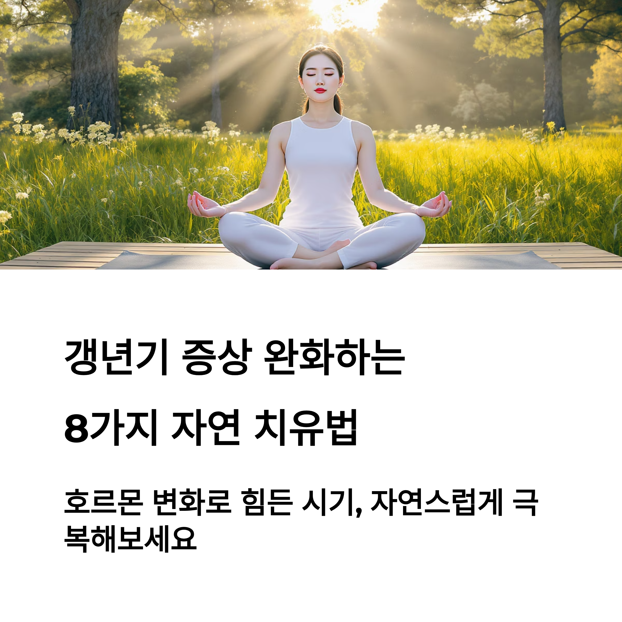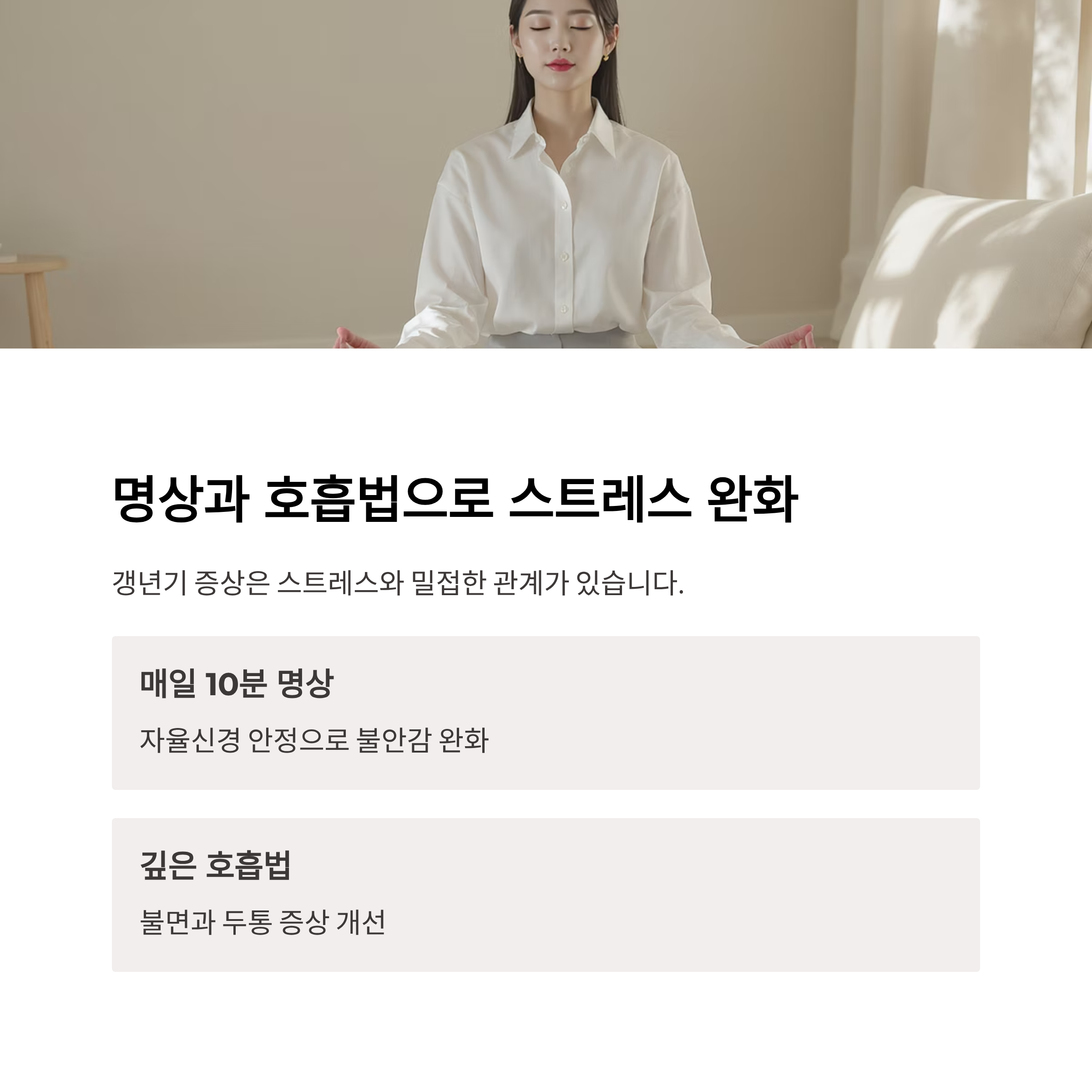 갱년기 증상은 스트레스와 밀접한 관계가 있습니다. 명상과 깊은 호흡을 통해 자율신경을 안정시키면 불면, 불안, 두통 완화에 효과적입니다. 매일 10분 정도의 짧은 명상도 큰 변화를 줍니다.