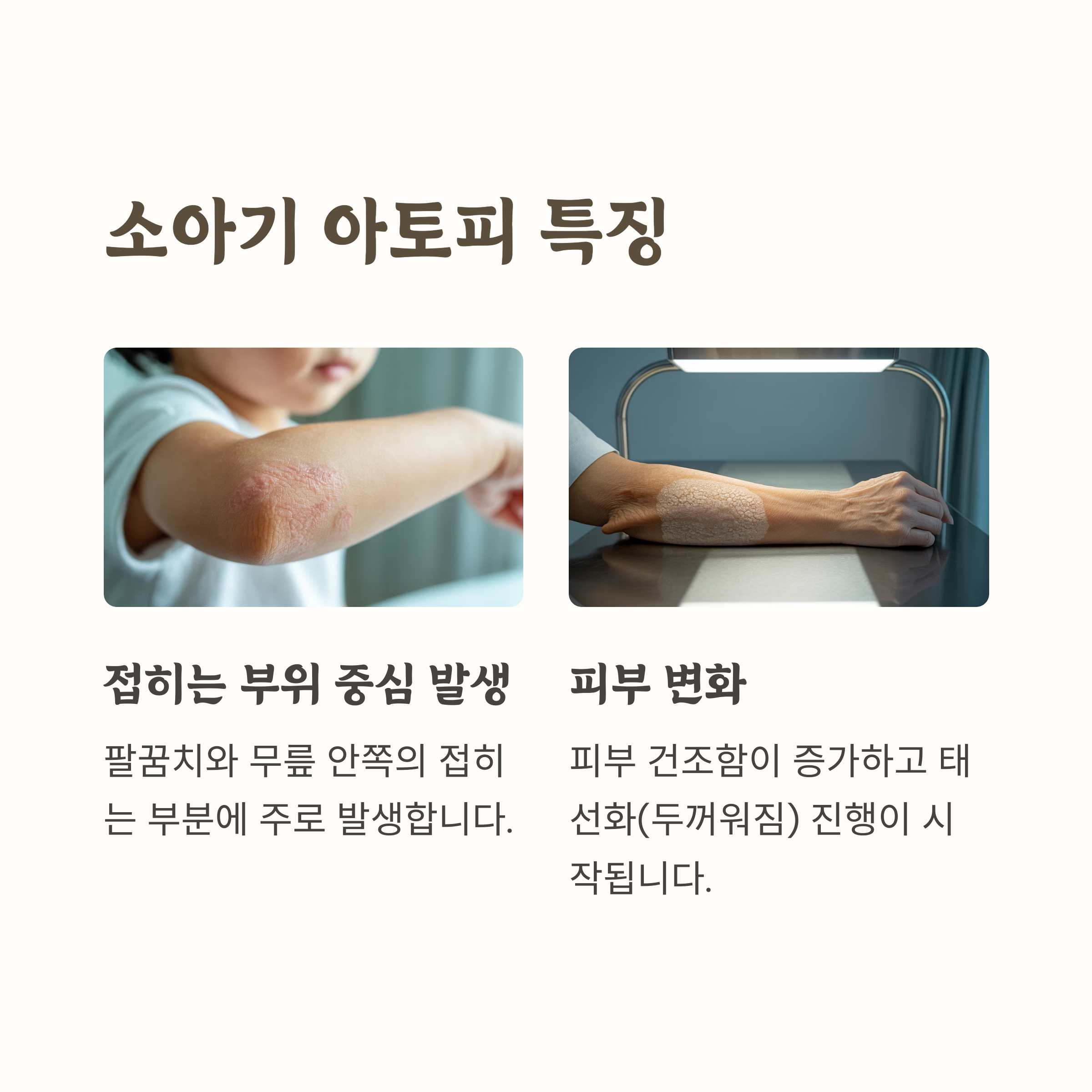 | 소아기 | 건조, 만성 가려움 | 목, 팔꿈치 안쪽, 무릎 뒤 |