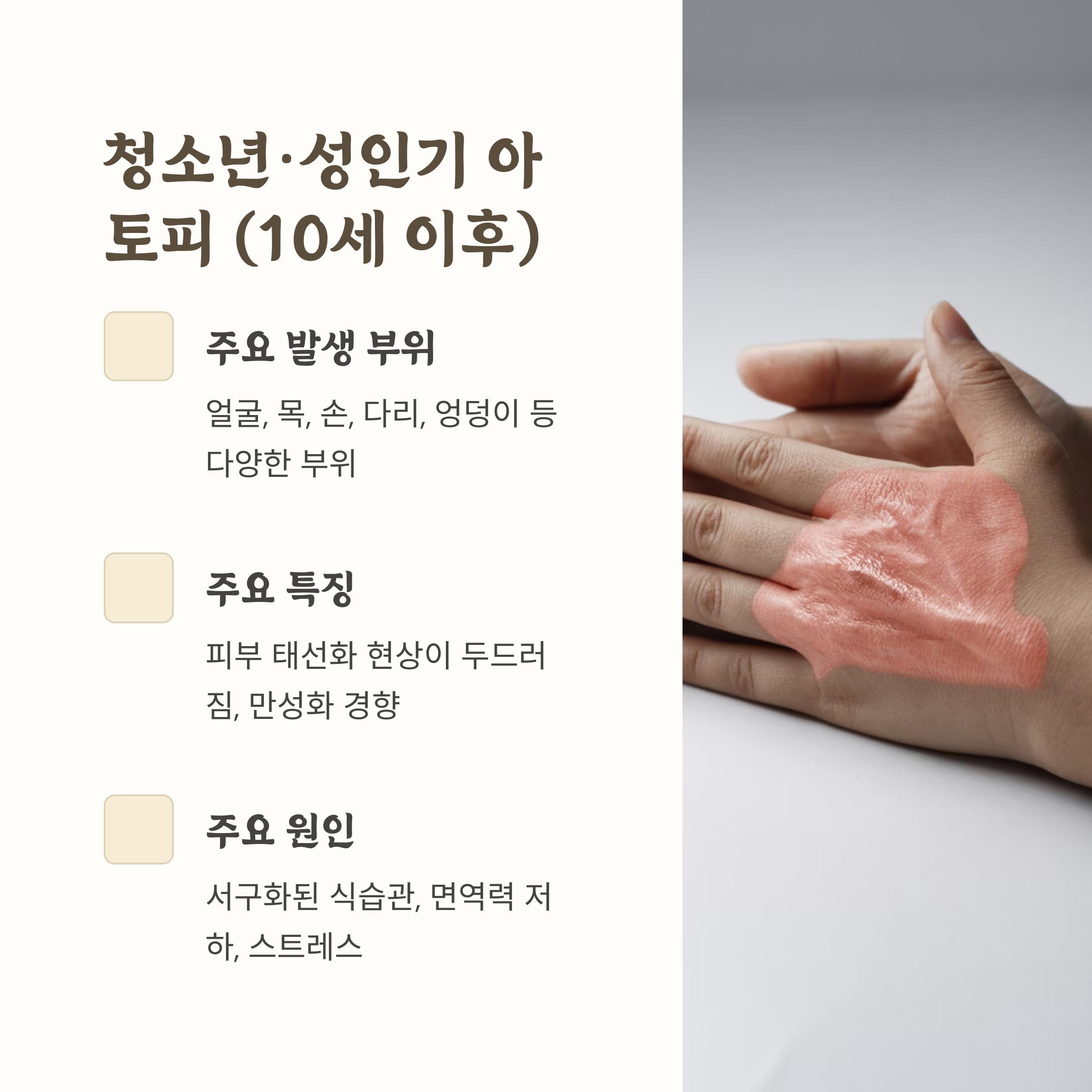 특히 유아기, 소아기, 청소년기 이후로 갈수록 피부의 건조함과 만성화가 심화되며