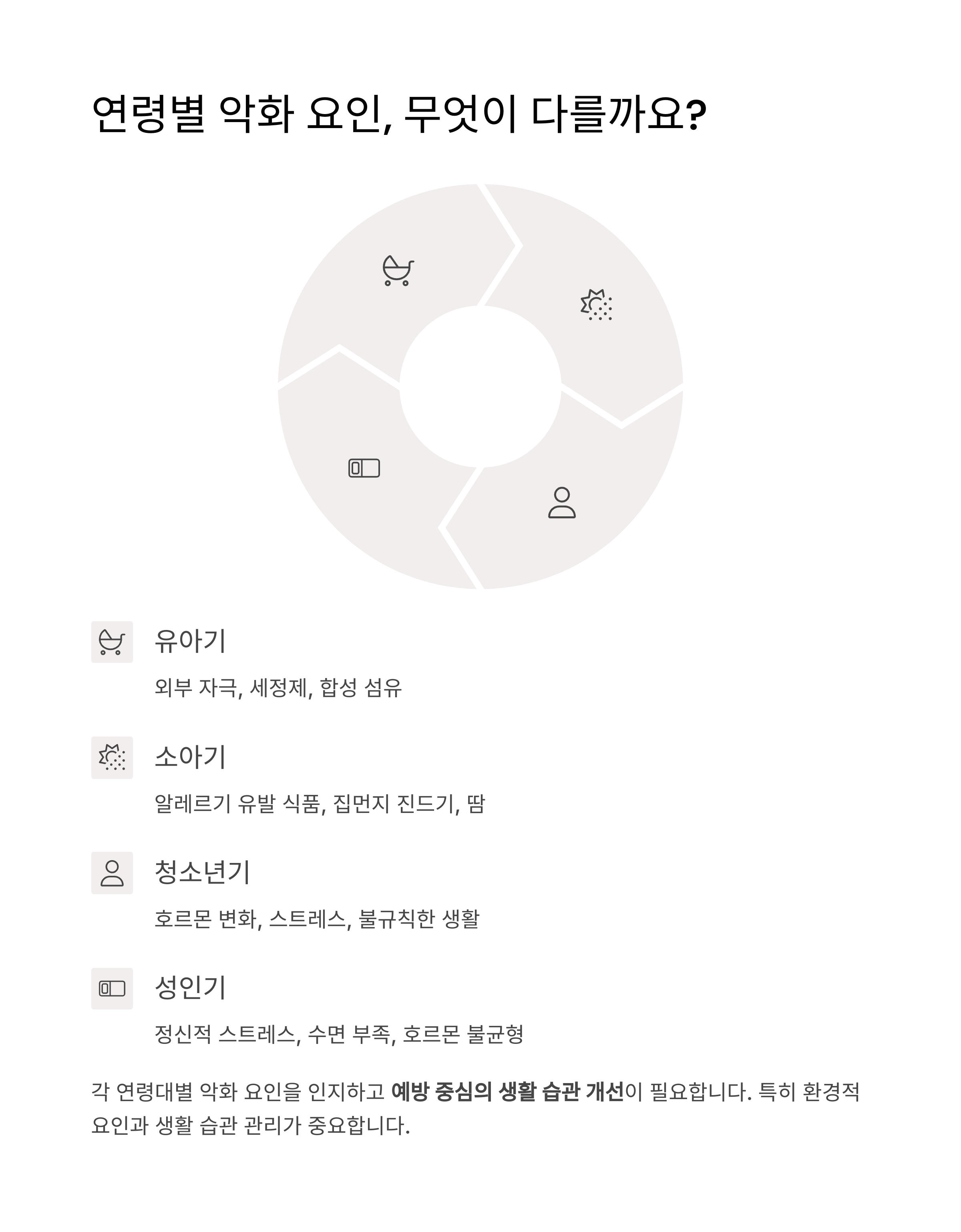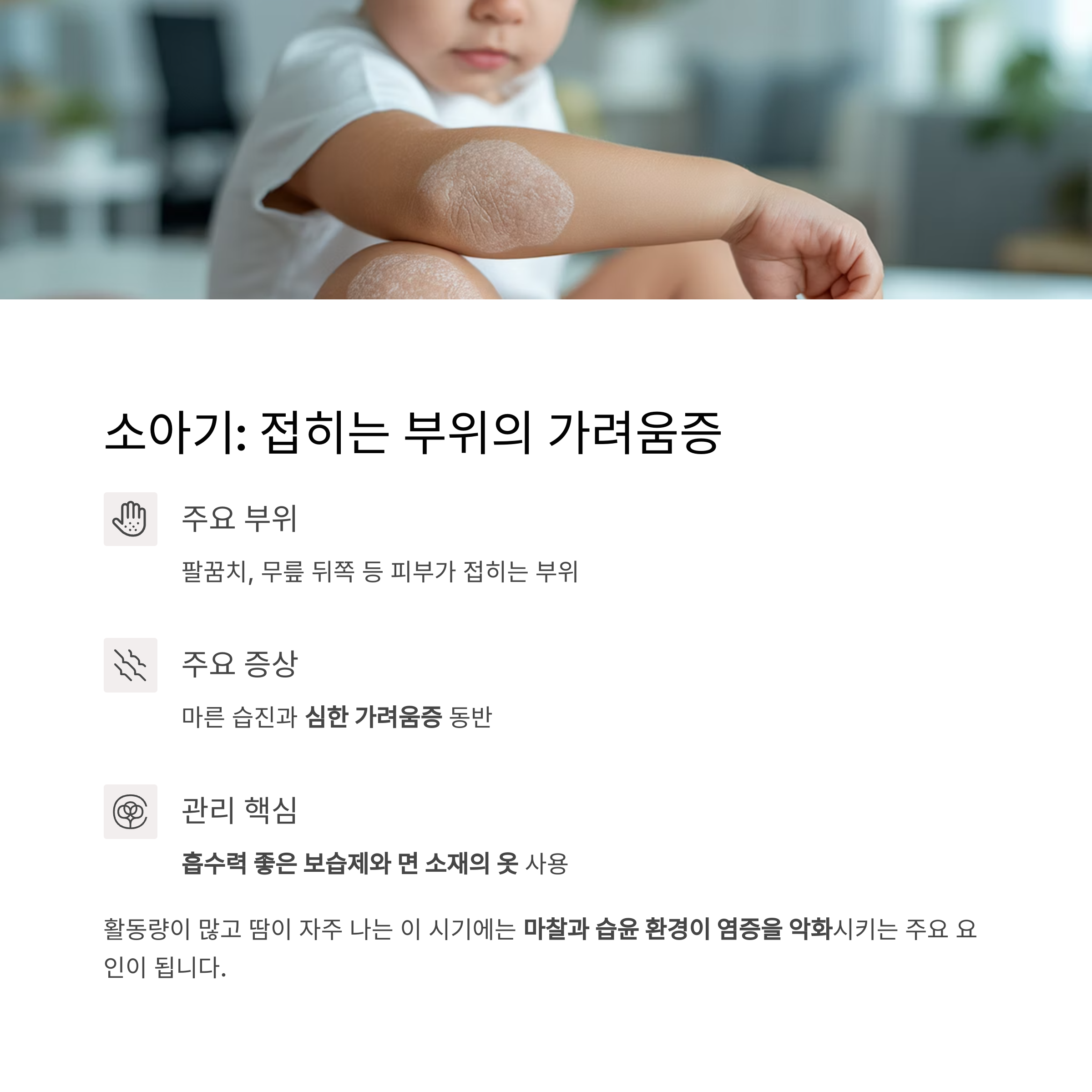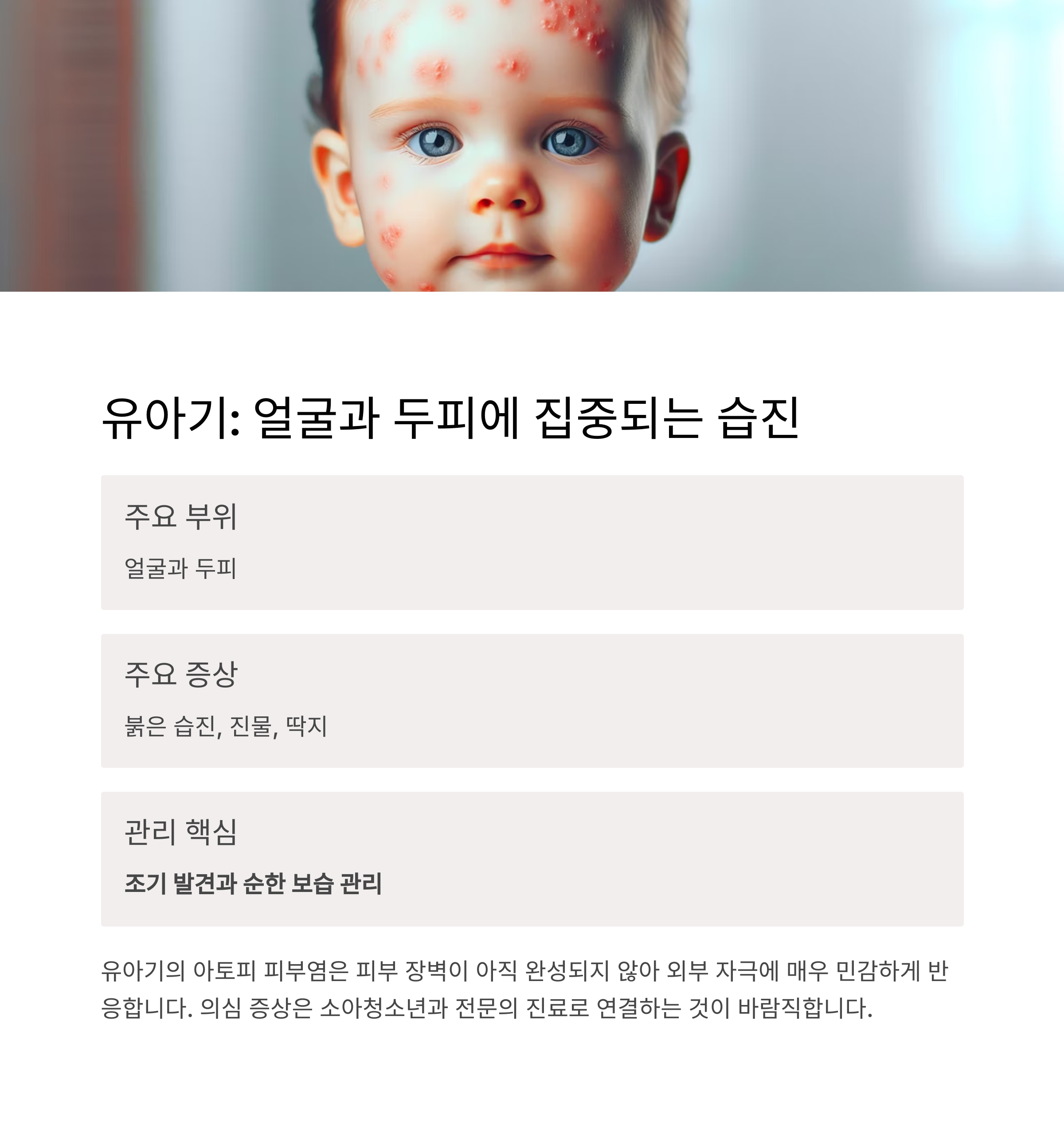 아토피 피부염은 연령대에 따라 증상과 주요 부위가 크게 달라지는 대표적인 만성 질환입니다.
