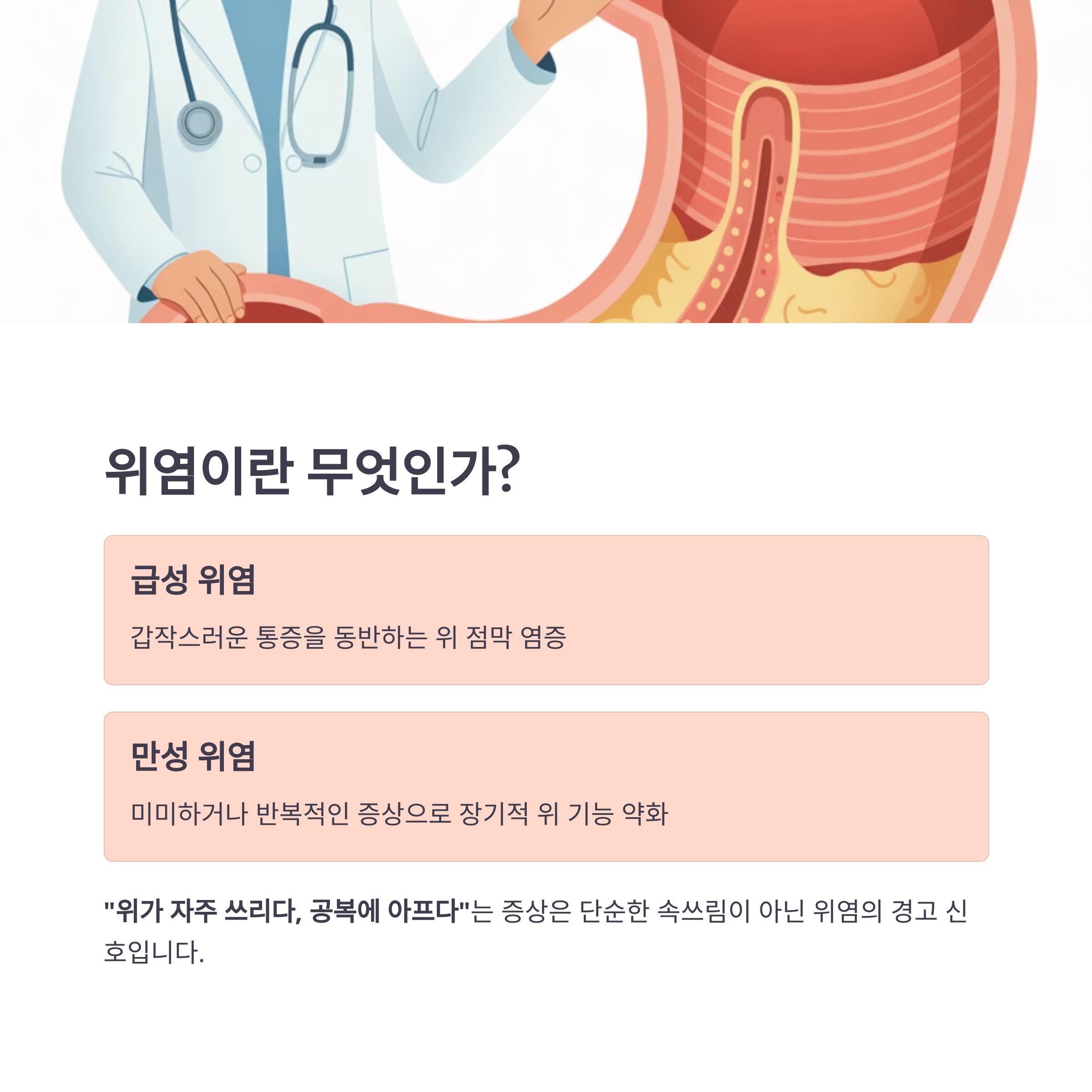 **"위가 자주 쓰리다, 공복에 아프다"**는 증상은 단순한 속쓰림이 아닌 위염의 경고 신호일 수 있습니다.